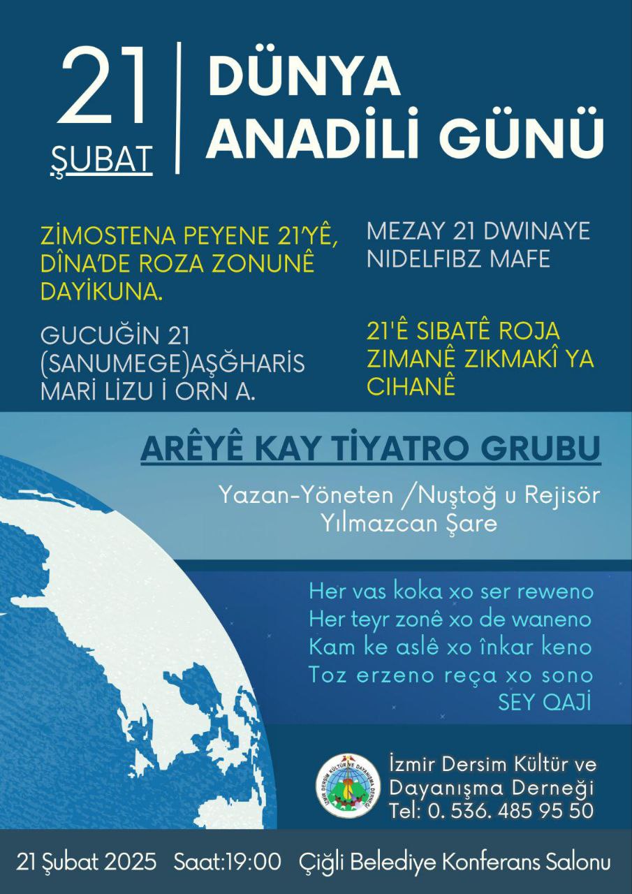 21 Şubat Dünya Ana Dili Günü’nde farkındalık yaratmak amacıyla İzmir’de Arêyê Kay Tiyatro Grubu’nun katılımıyla Kırmancki/Zazaca tiyatro oyunu sahnelenecek.