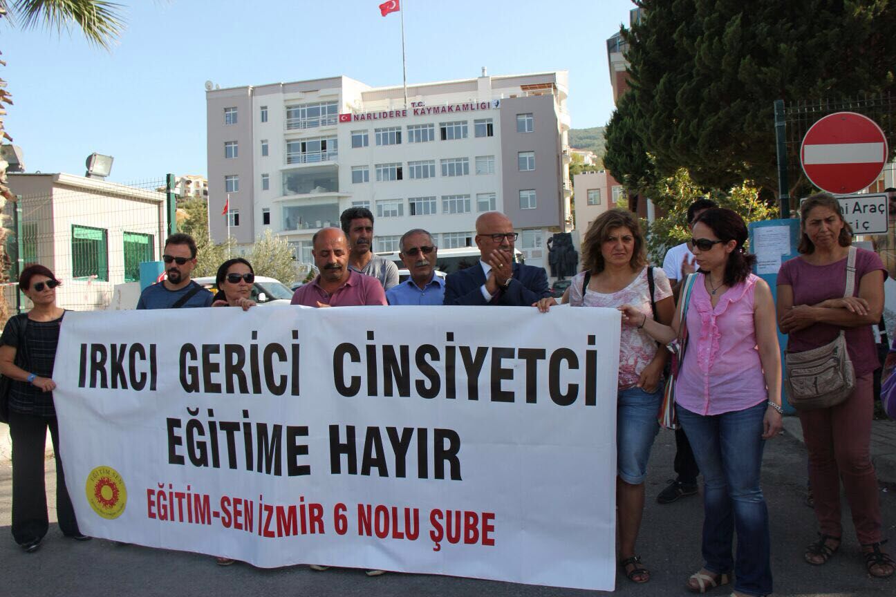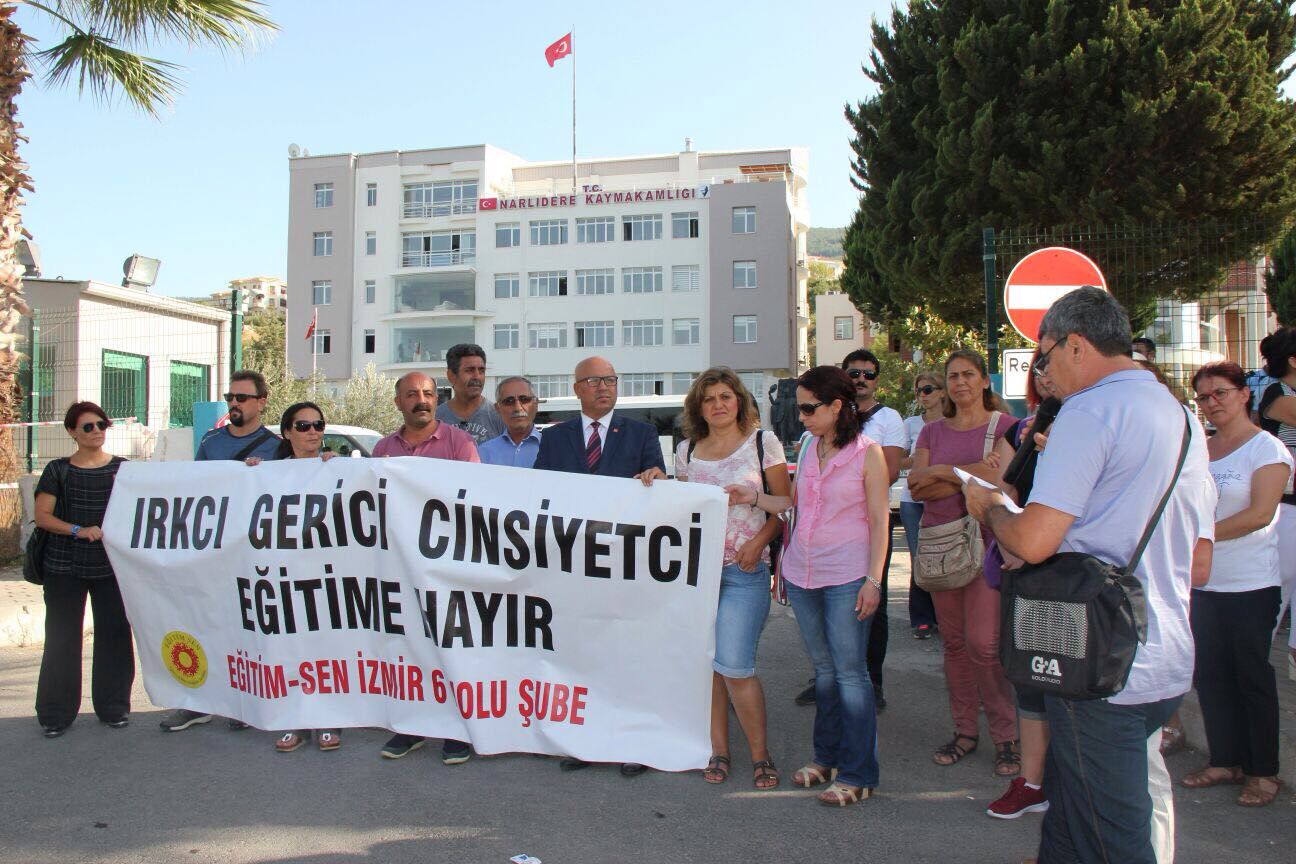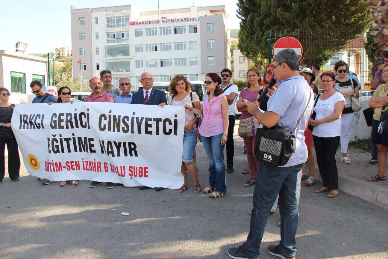 İzmir Eğitim -Sen 6 Nolu şube ve Narlıdere Cemevi öncülüğünde Narlıdere Milli Eğitim Müdürlüğü önünde yeni eğitim müfredatını protesto etmek için birçok yurttaşın katılımı ile basın açıklaması yapıldı. . Kitle adına basın açıklamasını eğitim sen 6 Nolu şube başkanı İsmet Sözer yaptı.