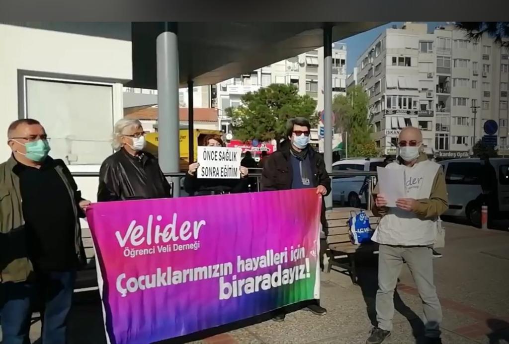 İzmir Karşıyaka’da Veli-Der Karşıyaka Şubesi Milli Eğitim Bakanlığı’nın (MEB) ortaokul ve liselerde sınavların yüz yüze yapılması kararını protesto ederek sınavların iptal edilmesini talep etmek için bir basın açıklaması yaptı.
