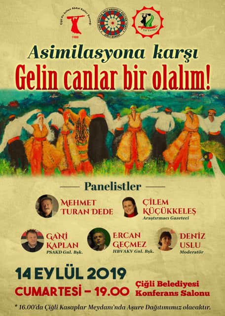 İzmir’de 14 Eylül Cumartesi günü ‘Asimilasyona karşı gelin canlar bir olalım’ konulu panel düzenlenecek. Hacı Bektaş Veli Anadolu Kültür Vakfı, Pir Sultan Abdal Kültür Derneği ve Yol Erenleri Derneği’nin düzenlediği panele Mehmet Turan Dede, Gazeteci Çilem Küçükkeleş, PSAKD Başkanı Gani Kaplan, HBVAKV Başkanı Ercan Geçmez katılacak. Çiğli Konferans salonunda saat 19.00’da yapılacak panelin moderatörlüğünü Deniz Uslu yapacak.