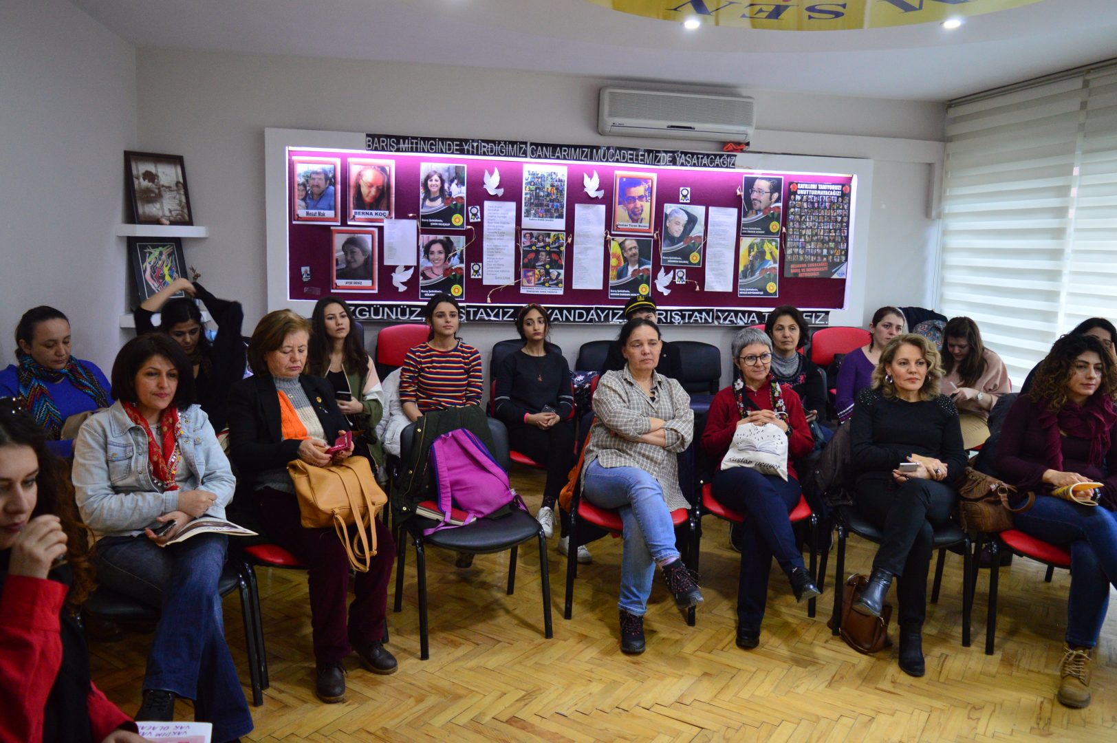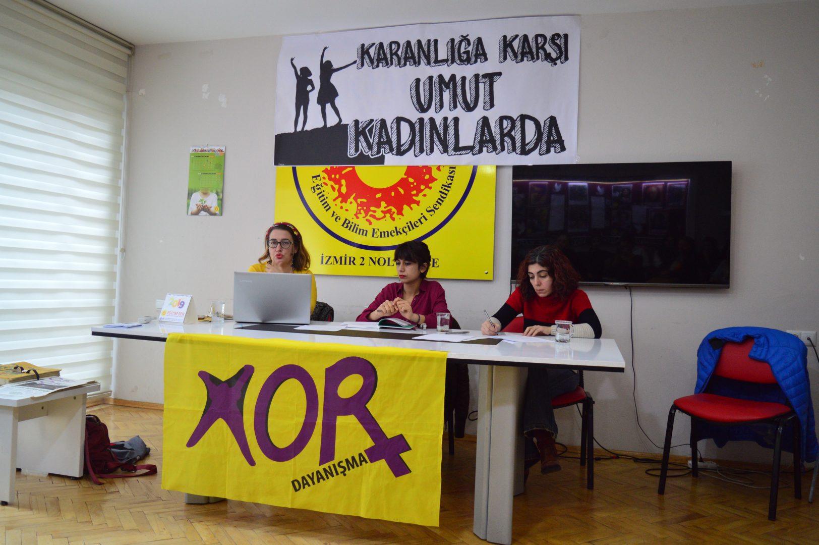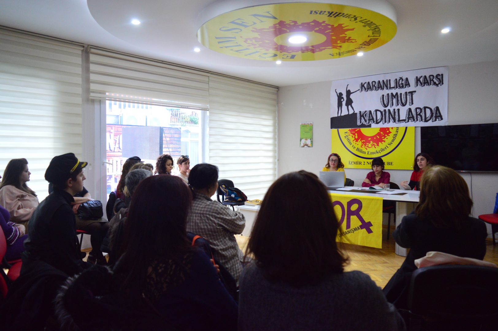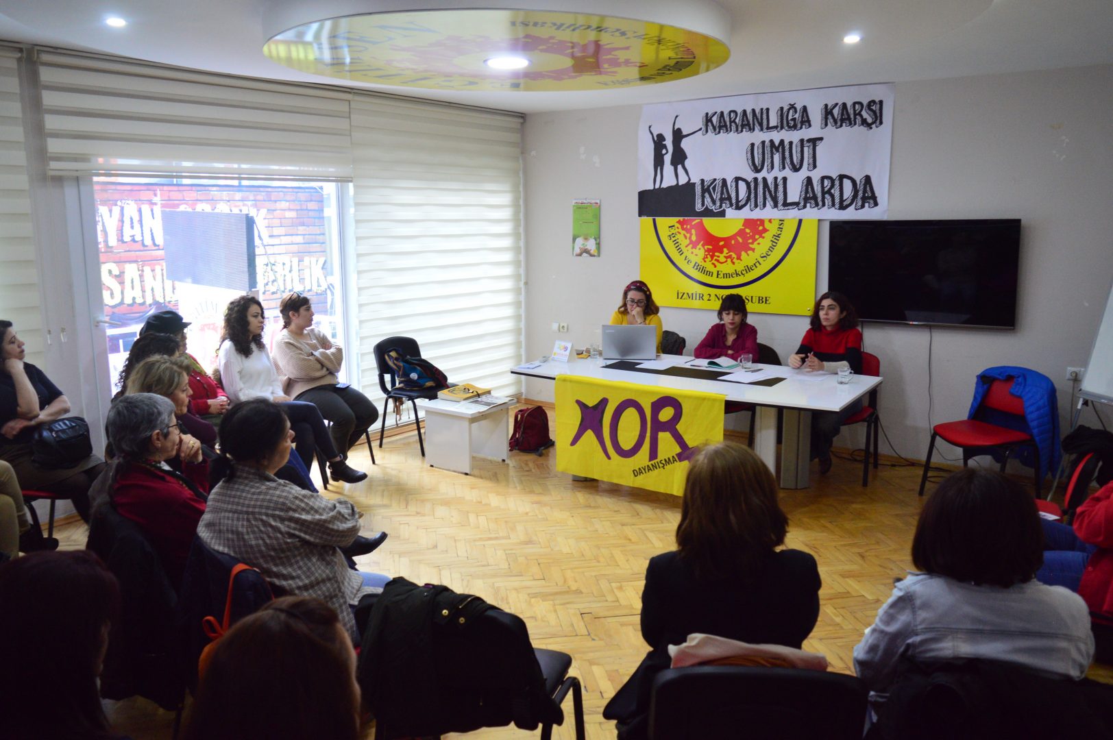 İzmir’de Mor Dayanışma’nın 8 Mart Dünya Emekçi Kadınlar Günü vesilesiyle düzenlediği panel İzmir Eğitim Sen 2 No’lu Şubede gerçekleşti. Salona ‘Karanlığa karşı umut kadınlarda’ dövizi asıldı. Çok sayıda kadının katıldığı panelde konuşmalardan sonra soru cevap şeklinde devam etti. Kadınların hukuksal olarak kazanımları, neler yapması gerektiği, yaşadığı hak ihlalleri konuları işlendi.