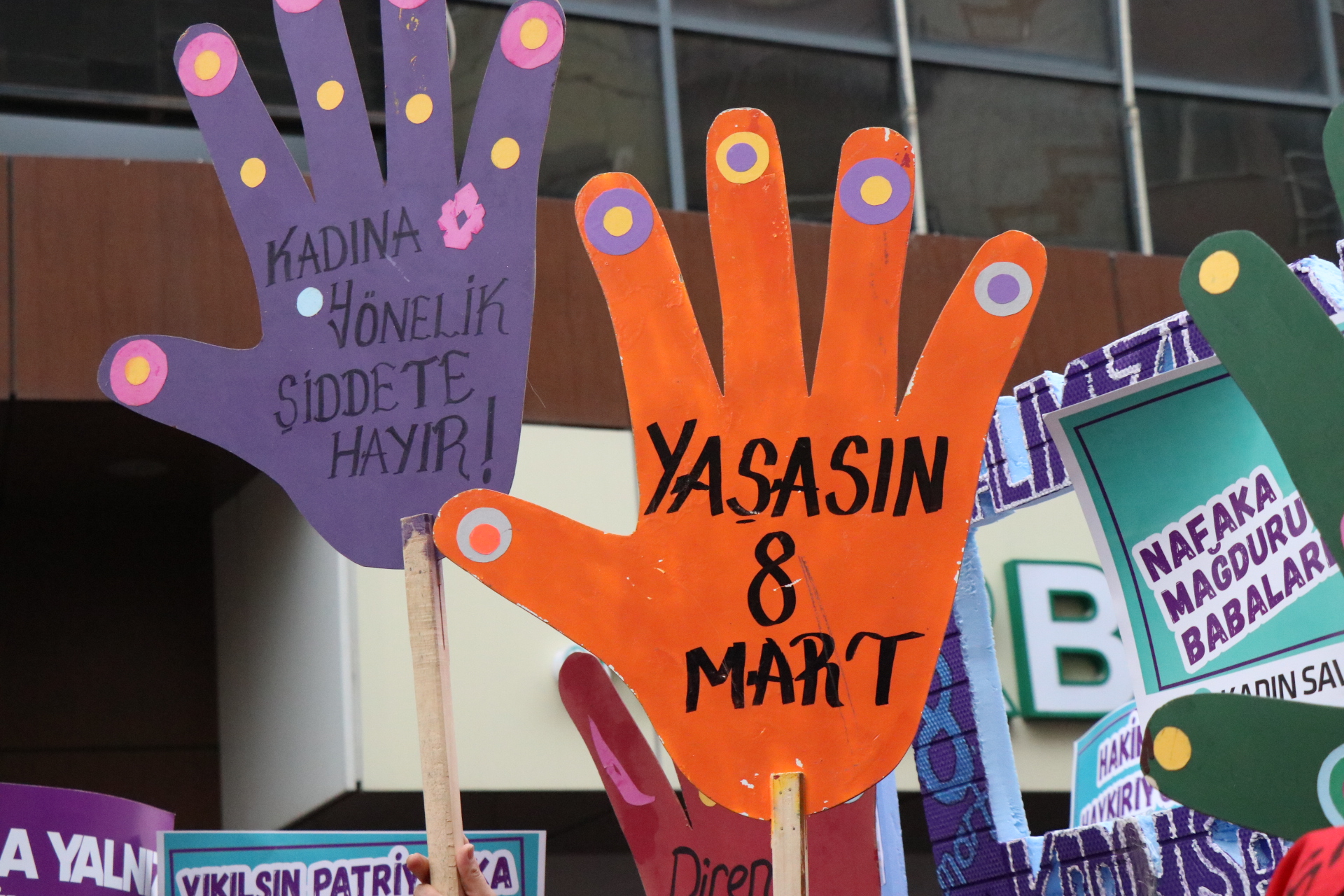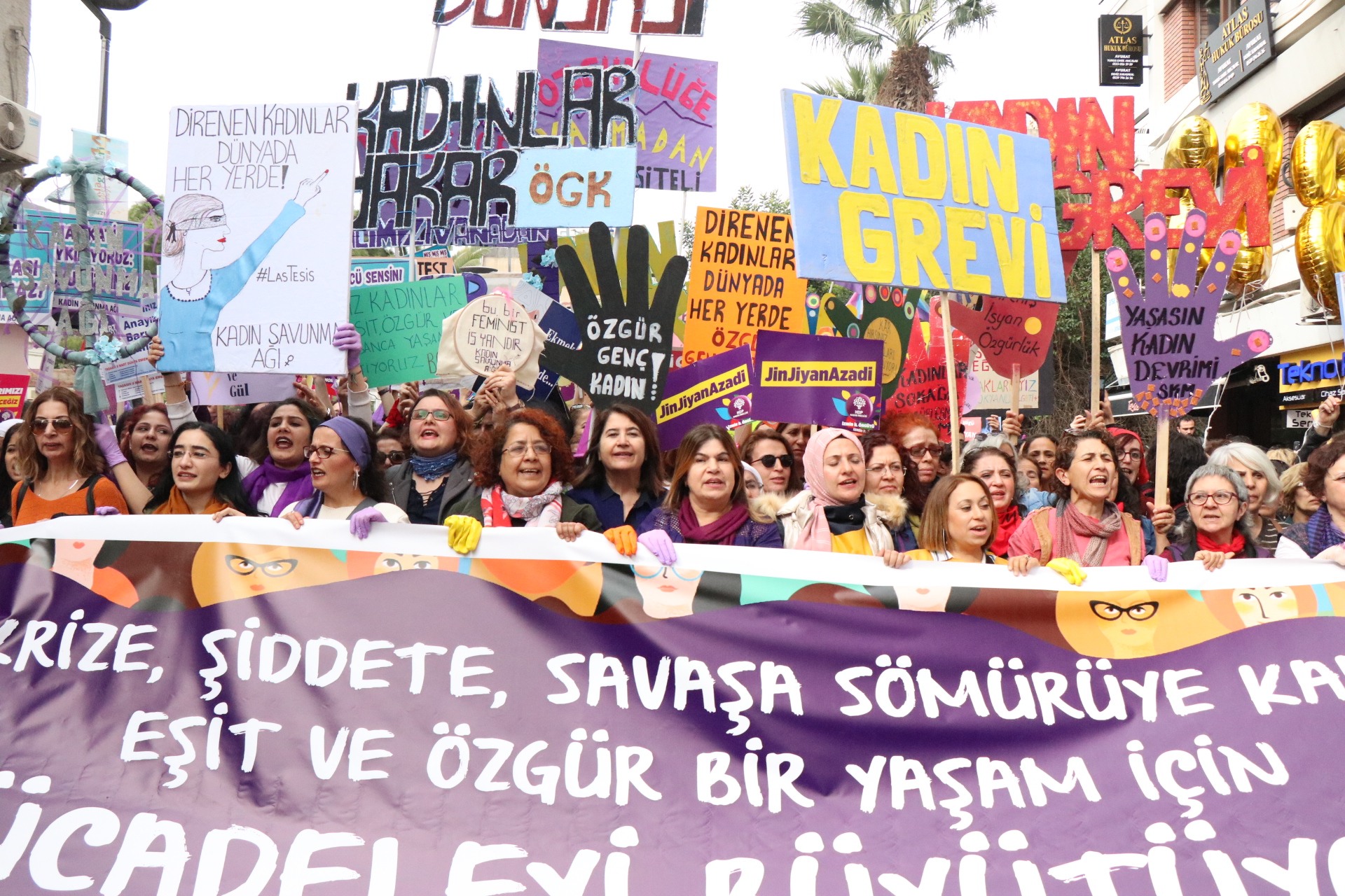 Eşit, özgür, bir yaşam için, krize, savaşa, şiddete, sömürüye karşı yan yana gelmeye, sesimizi yükseltmeye devam edeceğiz. Daha fazla kar isteyen sermayenin ve sermaye yanlısı AKP/ Erdoğan iktidarının yarattığı ekonomik krizin faturasını ödemeyeceğiz, biz kadınlar, sömürüye karşı emeğimize sahip çıkıyoruz! Eşit işe eşit ücret talep ediyoruz! Doğum izni süresinin 20 haftaya çıkarılmasını istiyoruz. 30 işçinin çalıştığı işyerlerine cinsiyete bakılmaksızın kreş zorunluluğunun getirilmesini istiyoruz. Her mahalleye ücretsiz kreş ve bakım evleri istiyoruz. Kayıt dışı, kuralsız, esnek ve yarı zamanlı çalışmanın yasaklanmasını, kadınlara güvenceli iş olanaklarının yaratılmasını istiyoruz. Mülteci haklarının tanınmasını istiyoruz. Kadın danışma ve dayanışma merkezleri, tecavüz kriz merkezleri açılmasını istiyoruz. Kadın cinayetlerinde iyi hal indirimlerinin sona ermesini istiyoruz. KHK’larla bir gecede ekmeğinden olan, sosyal ve politik yaşamdan uzaklaştırarak eve kapatılmak istenen kamu emekçisi kadınların işe geri dönmesini istiyoruz. Mücadelelerle kazanılmış, kayyumlar ve tutuklamalarla elimizden alınmak istenen eş başkanlık hakkımızı elimizden almanıza izin vermeyeceğiz. Erkek şiddeti ile katledilen, katilleri aklanmaya çalışılan kadınların hesabını hep birlikte soracağız. Daha önce defalarca geri çektirdiğimiz o yasayı meclisten geçirtmeyecek, çocuk istismarını aklatmayacağız. İstanbul Sözleşmesi, 6284 sayılı yasa, nafaka hakkı gibi haklarımızdan vazgeçmeyeceğiz. Yaşanılabilir bir dünya için barışı, laikliği, eşitliği savunmaya devam edeceğiz.”