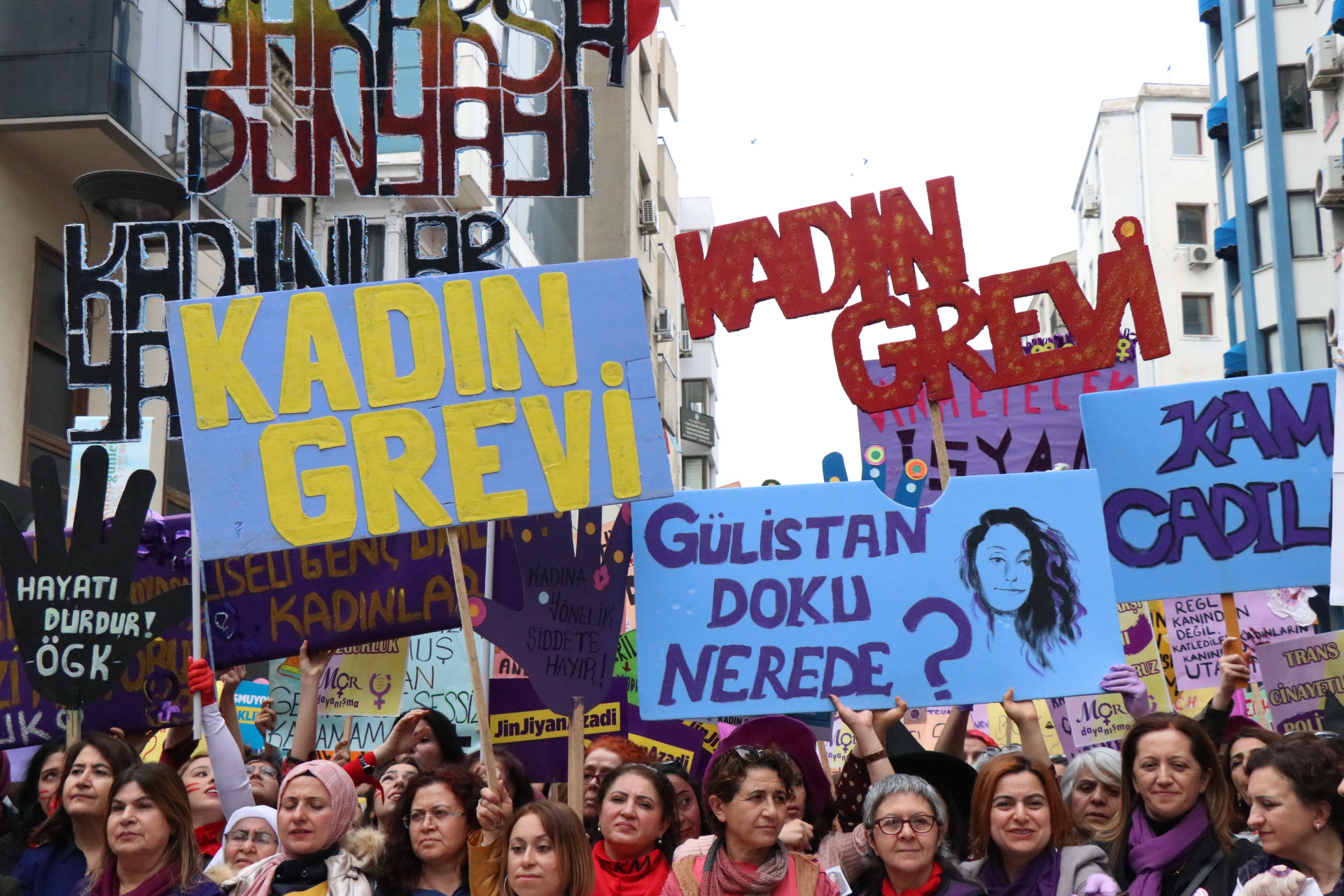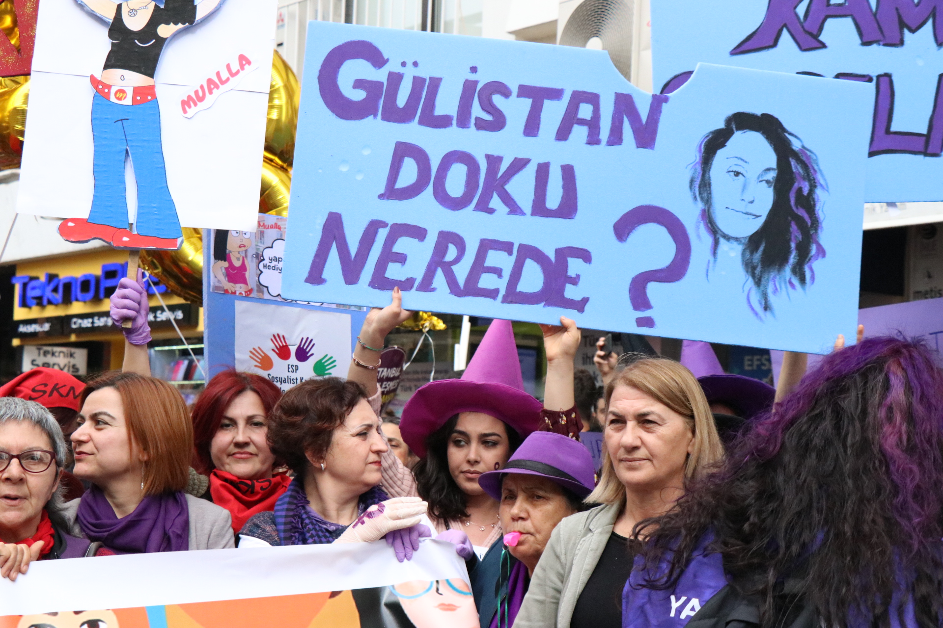 İzmir Kadın Platformu öncülüğünde 8 Mart Dünya Emekçi Kadınlar günü etkinliği yapıldı. Alsancak ÖSYM önünde bir araya gelen yüzlerce kadın Türkan Saylan kültür Merkezi’ne doğru yürüdü. Kadınlar hep bir ağızdan “Gülistan Doku nerede?” diye sorarak kadın cinayetlerine, taciz ve tecavüze dikkat çekti.
