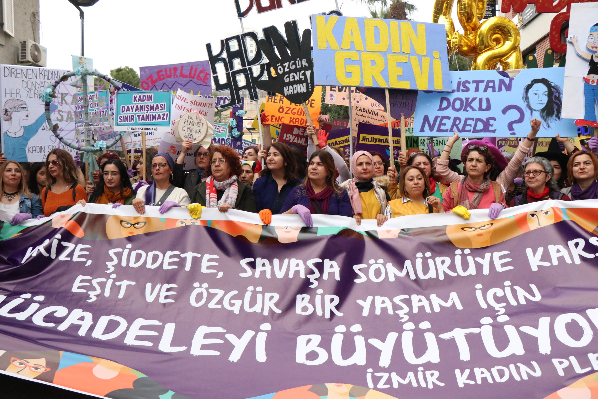 PİRHA – İzmir Kadın Platformu’nun çağrısıyla bir araya gelen yüzlerce kadın, ‘Kapitalizme, yoksulluğa, savaşa, şiddete, ayrımcılığa, ataerkiye karşı buradayız’ şiarıyla yürüyüş gerçekleştirdi.