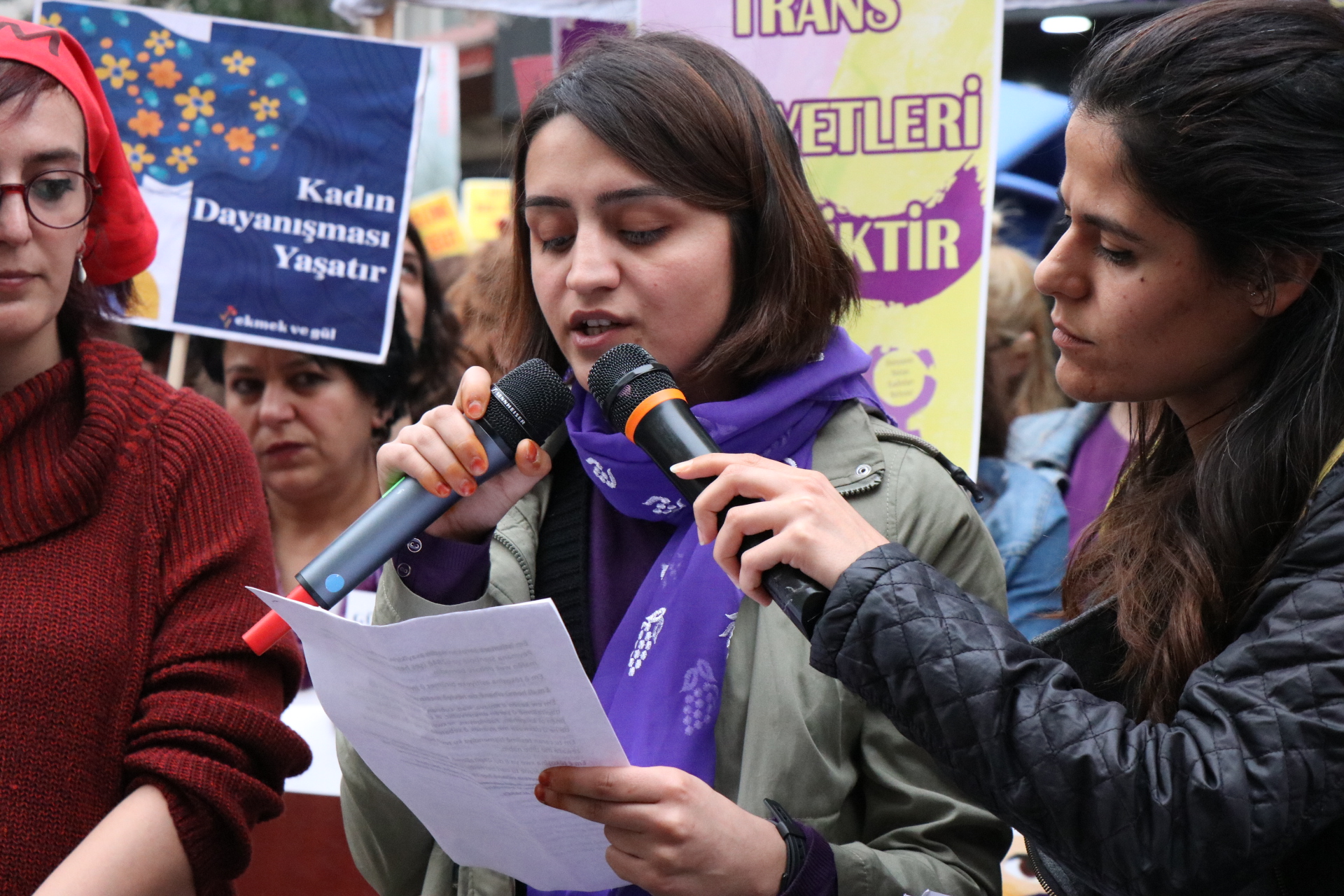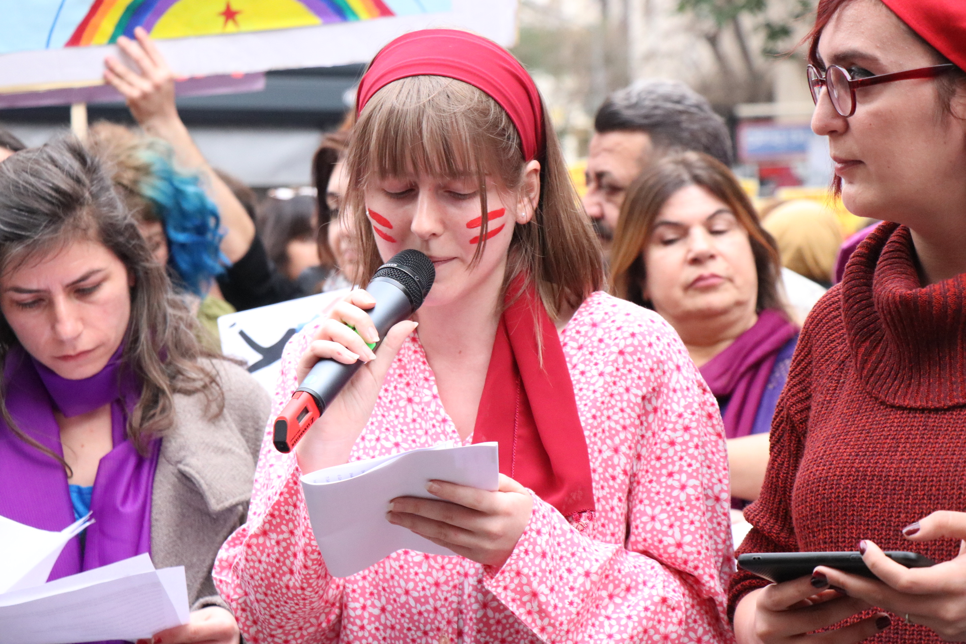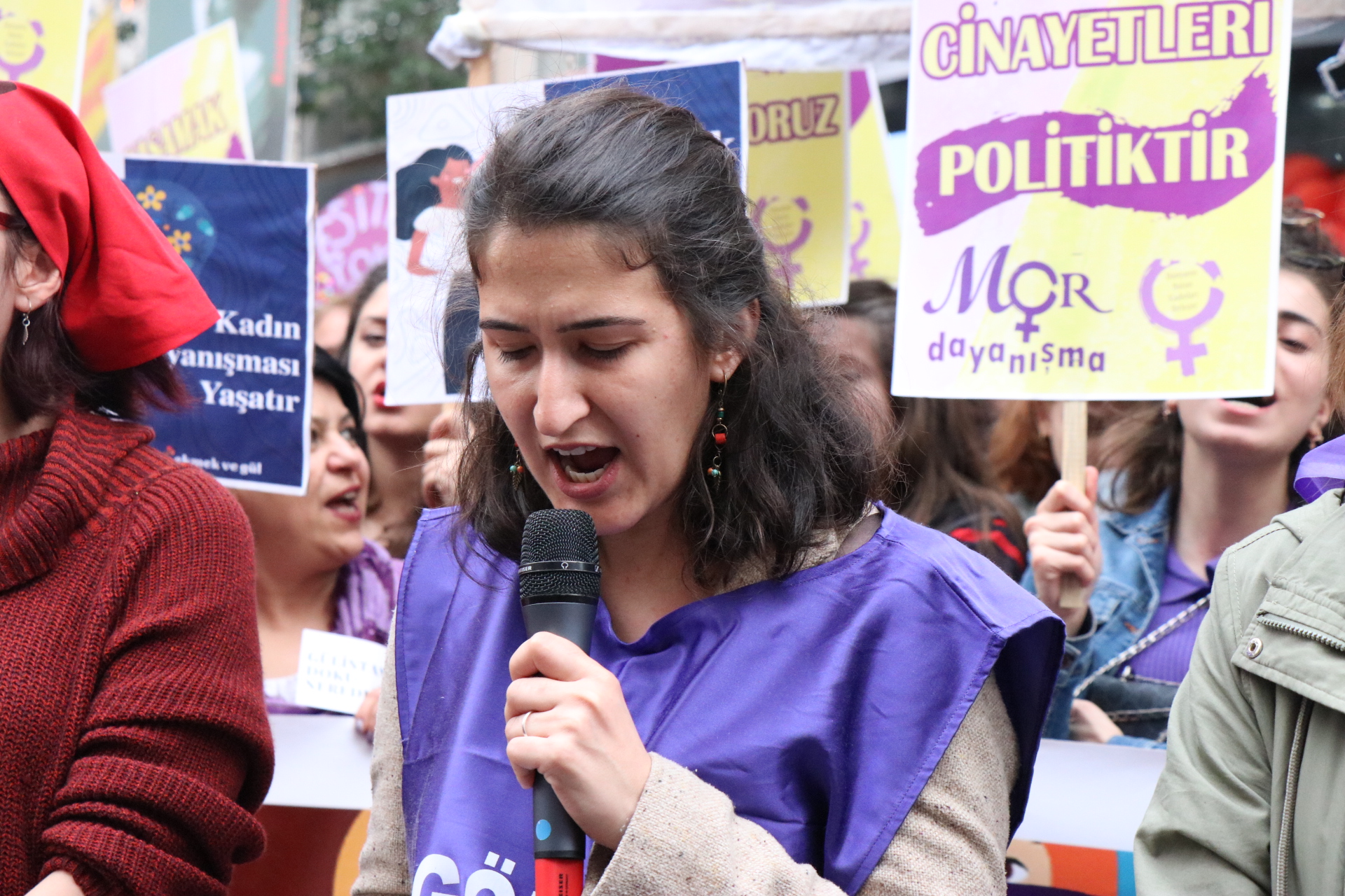 Bugün de yine aynı sebeplerle sokaktayız. Her gün bir kız kardeşimiz, şiddet yüzünden, yoksulluğun, yoksunluğun, yalnızlığın bunaltması yüzünden, ağır çalışma koşulları, uzun mesailer ve iş yerinde alınmayan önlemlerin yarattığı işçi cinayetleri yüzünden aramızdan koparılırken; biz, kopmaz bağlarla birbirimize sarılmak, o bağlarla birbirine ve hayata sımsıkı tutunan kadınların sayısını çoğaltmak üzere buradayız” ifadelerini kullandı.
