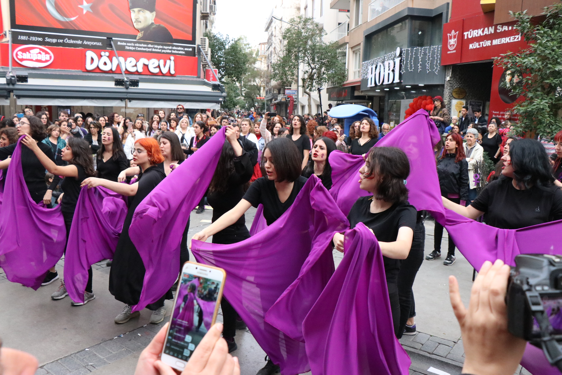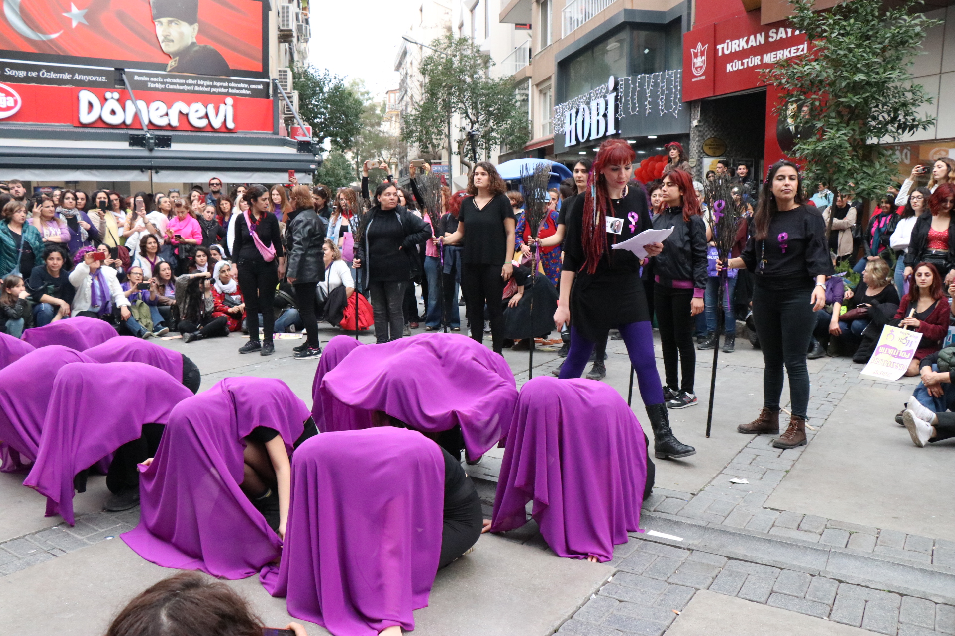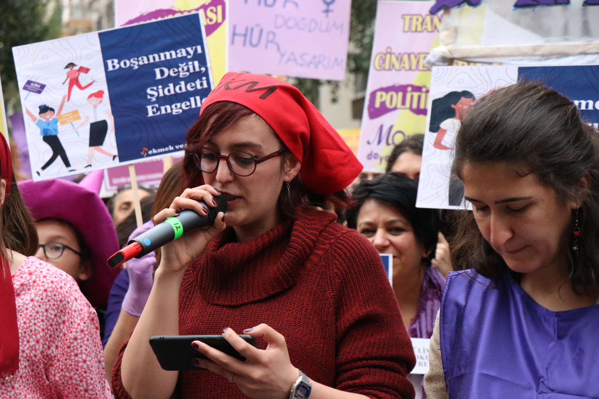 Bugün de yine aynı sebeplerle sokaktayız. Her gün bir kız kardeşimiz, şiddet yüzünden, yoksulluğun, yoksunluğun, yalnızlığın bunaltması yüzünden, ağır çalışma koşulları, uzun mesailer ve iş yerinde alınmayan önlemlerin yarattığı işçi cinayetleri yüzünden aramızdan koparılırken; biz, kopmaz bağlarla birbirimize sarılmak, o bağlarla birbirine ve hayata sımsıkı tutunan kadınların sayısını çoğaltmak üzere buradayız” ifadelerini kullandı.