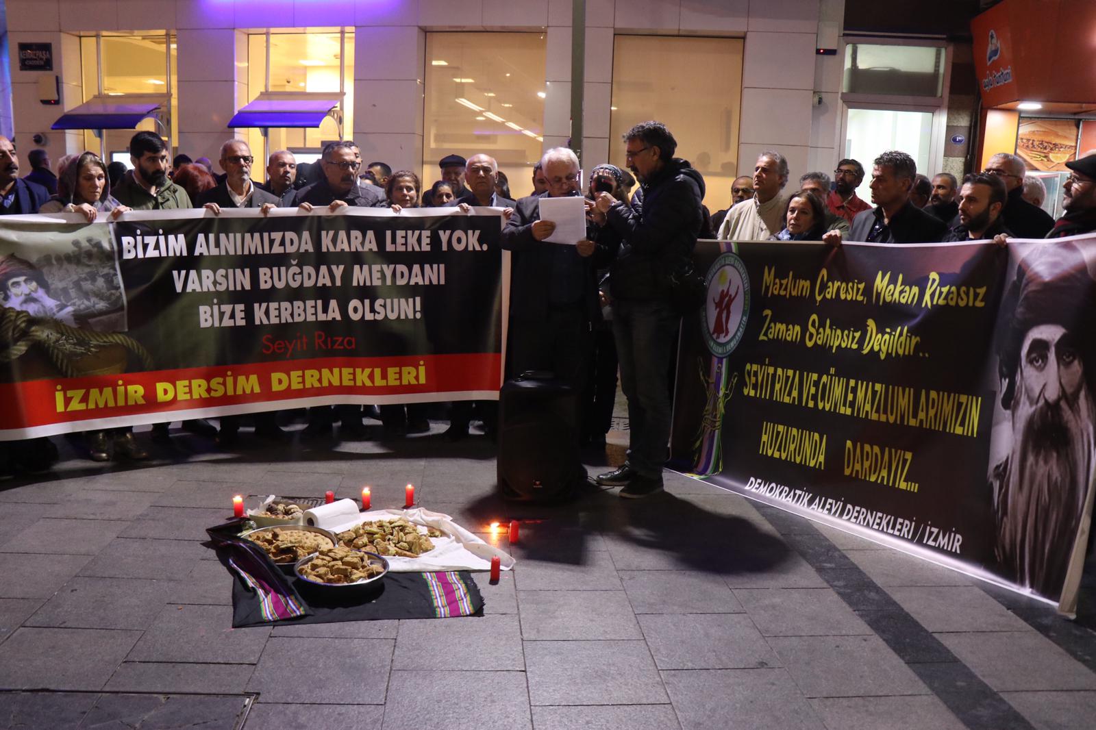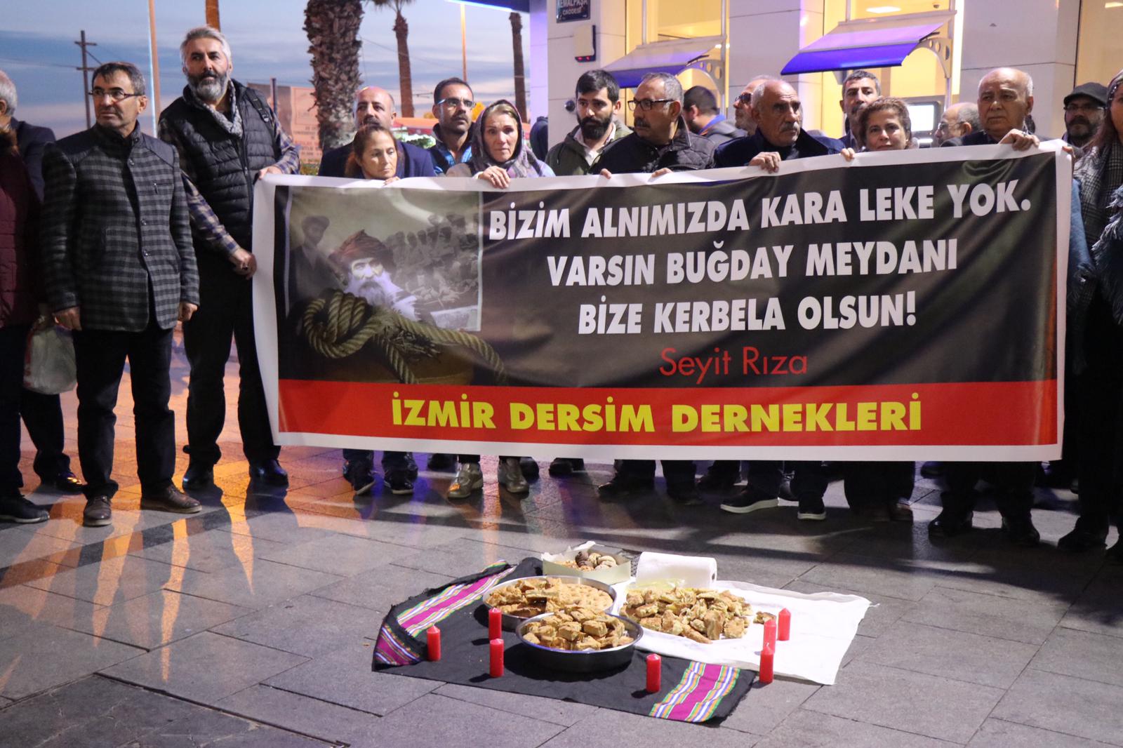 PİRHA- Seyit Rıza ve yoldaşları idam edilişlerinin 81.’nci yıl dönümlerinde İzmir’de kitlesel bir eylem ile anıldı. Yapılan açıklamada, “Dersim, İttihatçı-Kemalist politikalar bağlamında, tek tip iktidar alanı yaratmaya koşullu kıyımlar zincirinin halkalarından biridir. Dersim isyan etmemiş, üstüne gelen bir zulüm dalgası karşısında her canlının yaptığı gibi yaşam hakkını ve yaşam alanını savunmak için çok sınırlı olanaklarıyla direnmiştir” denildi.