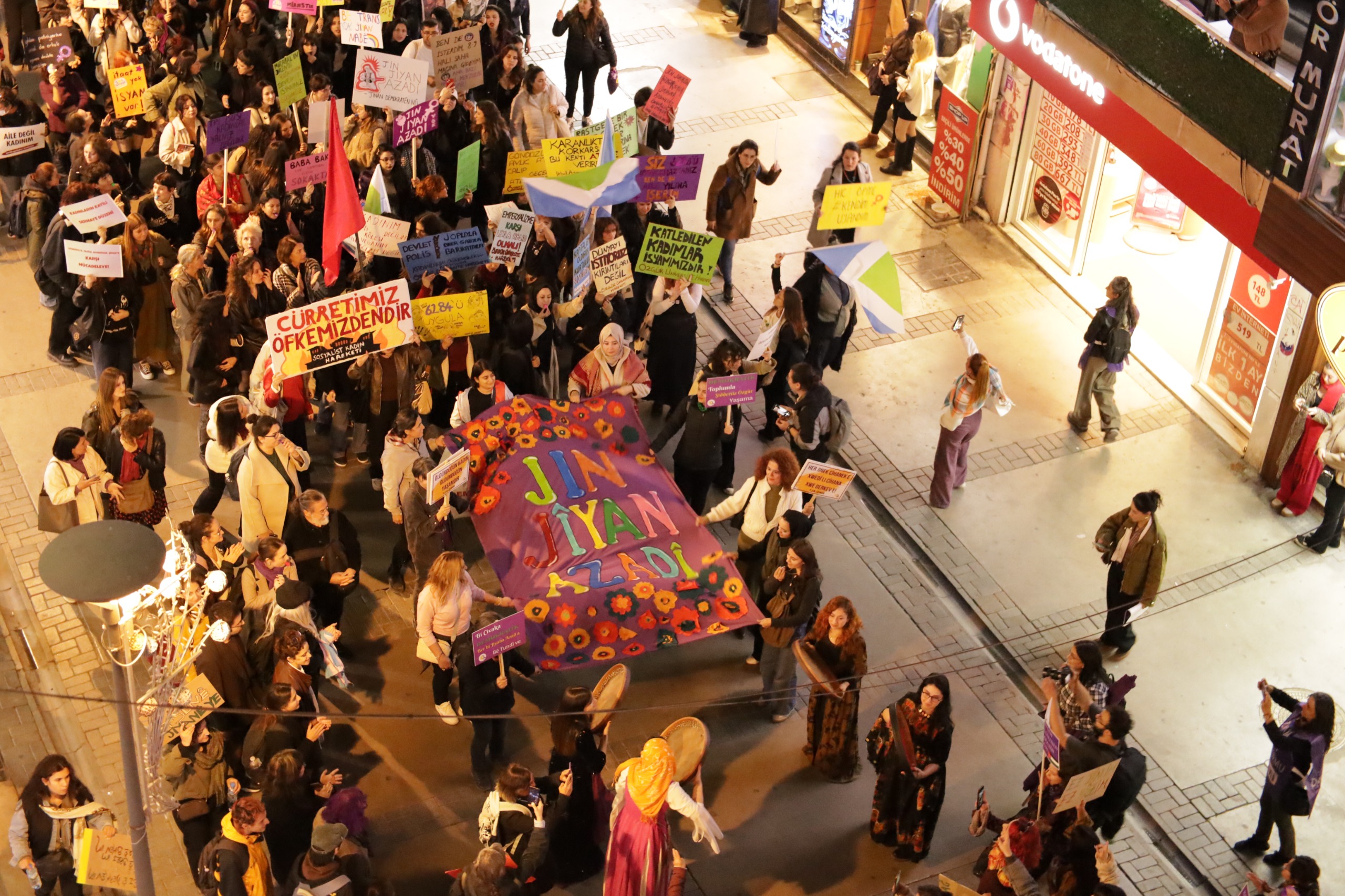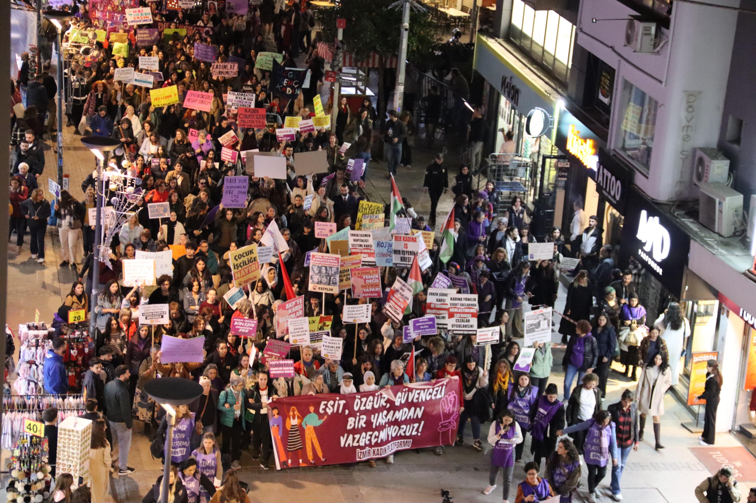 PİRHA- İzmir’de eşit, özgür ve şiddetsiz bir yaşam talebiyle Alsancak sokaklarını dolduran kadınlar, toplumsal cinsiyet eşitsizliğine, emek sömürüsüne ve görünmezliğine, “Aile Yılı” ilanına karşı seslerini yükselterek “Barış için dayanışma ve mücadeleye devam” mesajı verdi.