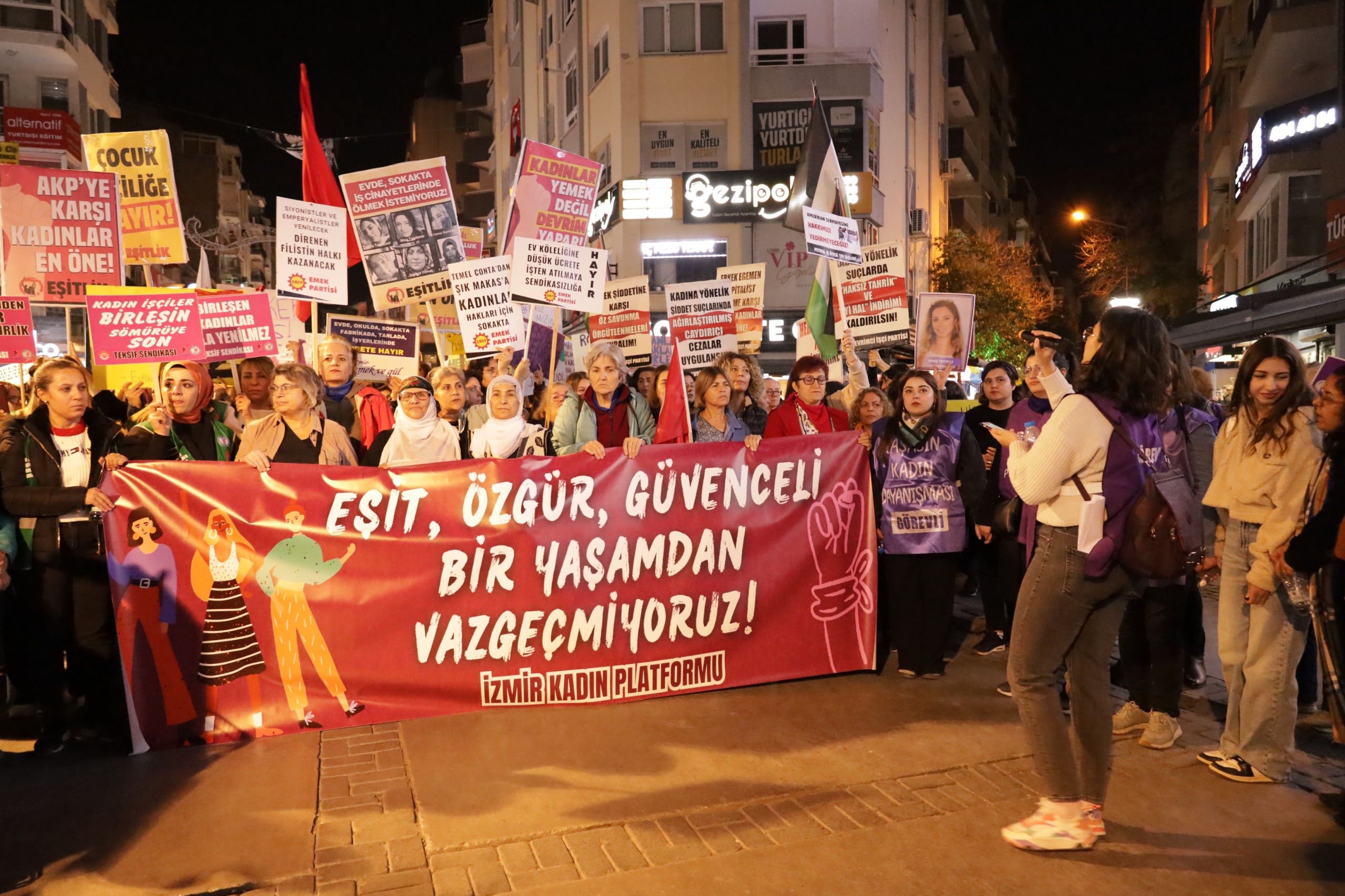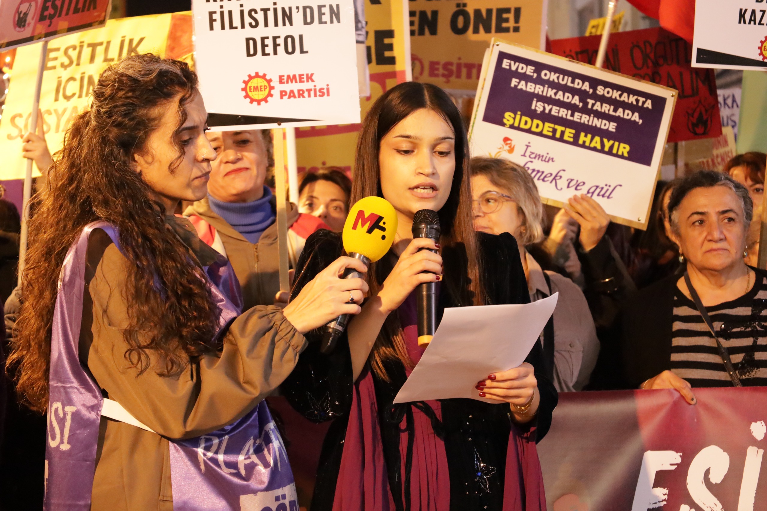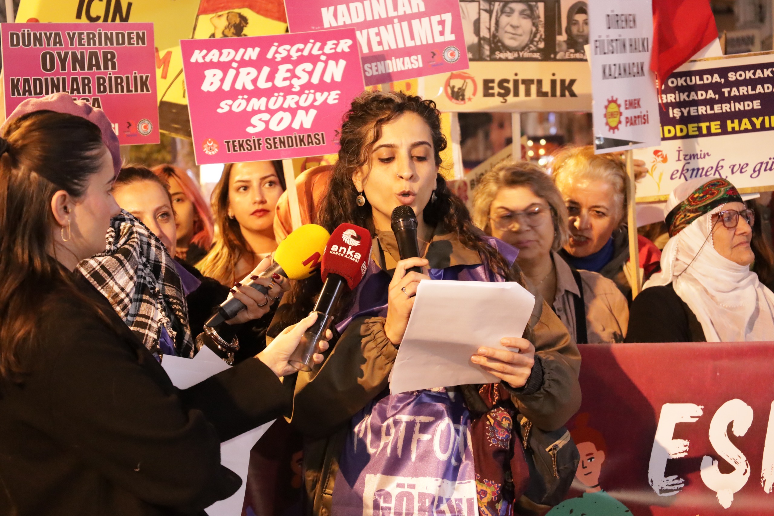 25 Kasım Kadına Yönelik Şiddete karşı Uluslararası Mücadele Günü dolayısıyla İzmir’de alana çıkan kadınlar, şiddete, yoksulluğa, eşitsizliğe ve savaşa karşı ses çıkardı. Kadınlar, her alanda dayanışma ve mücadeleyi büyüteceklerini belirtti.