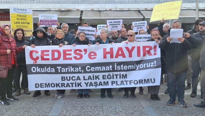Buca Laik Eğitim Demokratik Yaşam Platformu, Milli Eğitim Bakanlığı’nın Diyanet ile yaptığı Çevreme Duyarlıyım Değerlerimi Biliyorum (ÇEDES) protokolü uygulamalarına yönelik Buca Şirinyer’de basın açıklaması düzenledi. “ÇEDES’e hayır! Okulda tarikat, cemaat istemiyoruz” pankartı açılan açıklamada, “Laik, bilimsel, demokratik eğitim”, “ÇEDES protokolü iptal edilsin” ve “Savaşa değil çocuklara bütçe” dövizleri taşındı.