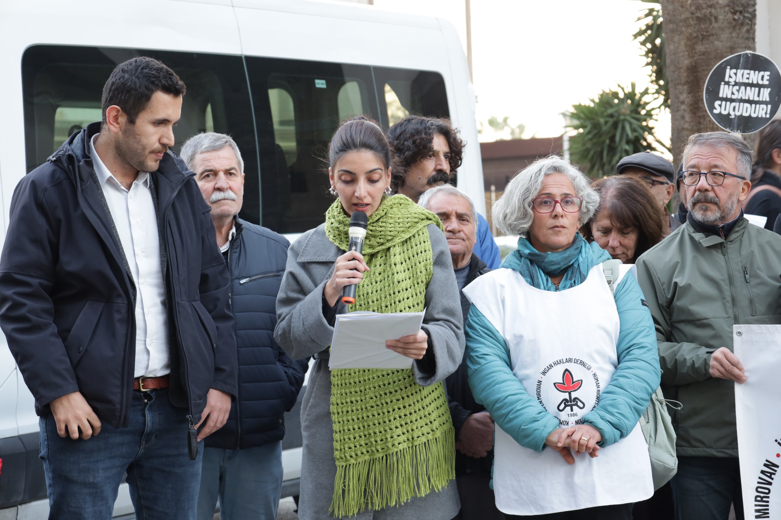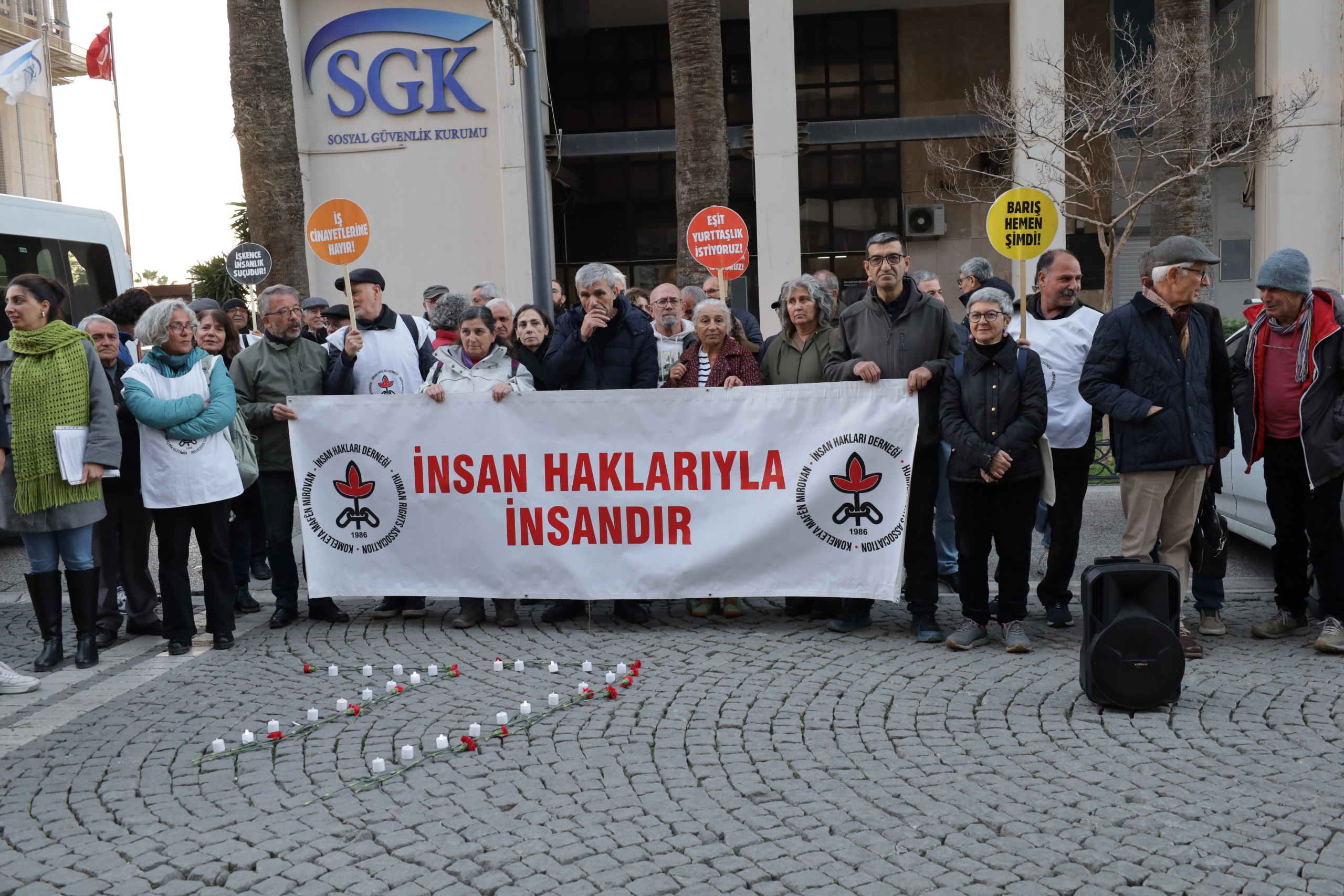 “İnsan haklarıyla insandır” pankartının açıldığı açıklamada, “İş cinayetlerine hayır”, “eşit yurttaşlık isiyoruz”, “Barış hemen şimdi” dövizleri taşındı. Çok sayıda siyasi parti ve sivil toplum örgütü temsilcisinin katıldığı eylemde basın açıklamasını İHD İzmir Şube Eşbaşkanı Zilan Gümüş yaptı.