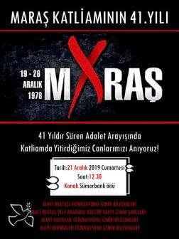 Maraş Katliamı’nıın 41. Yılında yaşamını yitirenler anılacak. İzmir’de 21 Aralık Cumartesi günü saat:12.30’da Konak Sümer Bank önünde anma yapılacak. Anmayı Alevi Bektaşi Federasyonu İzmir Bileşenleri, Hacı Bektaşi Veli Anadolu Kültür Vakfı İzmir Şubeleri, Alevi Vakıflar Federasyonu İzmir Bileşenleri ve Alevi Dernekler Federasyonu İzmir Bileşenler gerçekleştirecek.