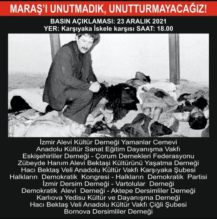 İzmir’de, ‘Maraş’ı unutmadık, unutturmayacağız’ şiarıyla saat 18.00’de Karşıyaka İskele karşısında basın açıklaması yapılacak.