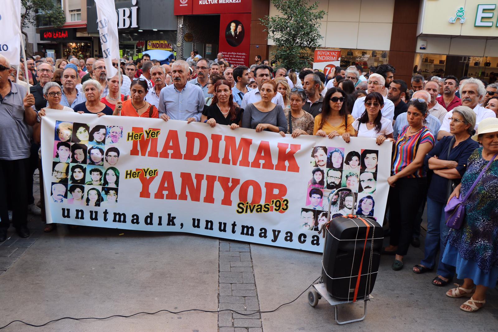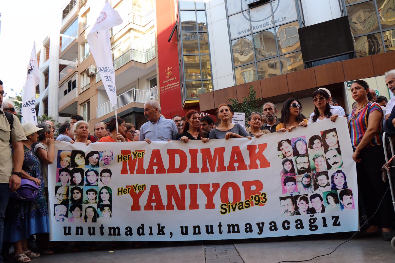 İzmir’de bulunan Alevi kurumlarının temsilcileri ve üyeleri, Sivas Katliamı’nın 26. yılında hayatını kaybedenleri andı. Kurumlar adına basın açıklamasını Pir Sultan Abdal Kültür Derneği (PSAKD) Çeşme Şubesi Cemevi Başkanı Sedat Mutlu okudu.