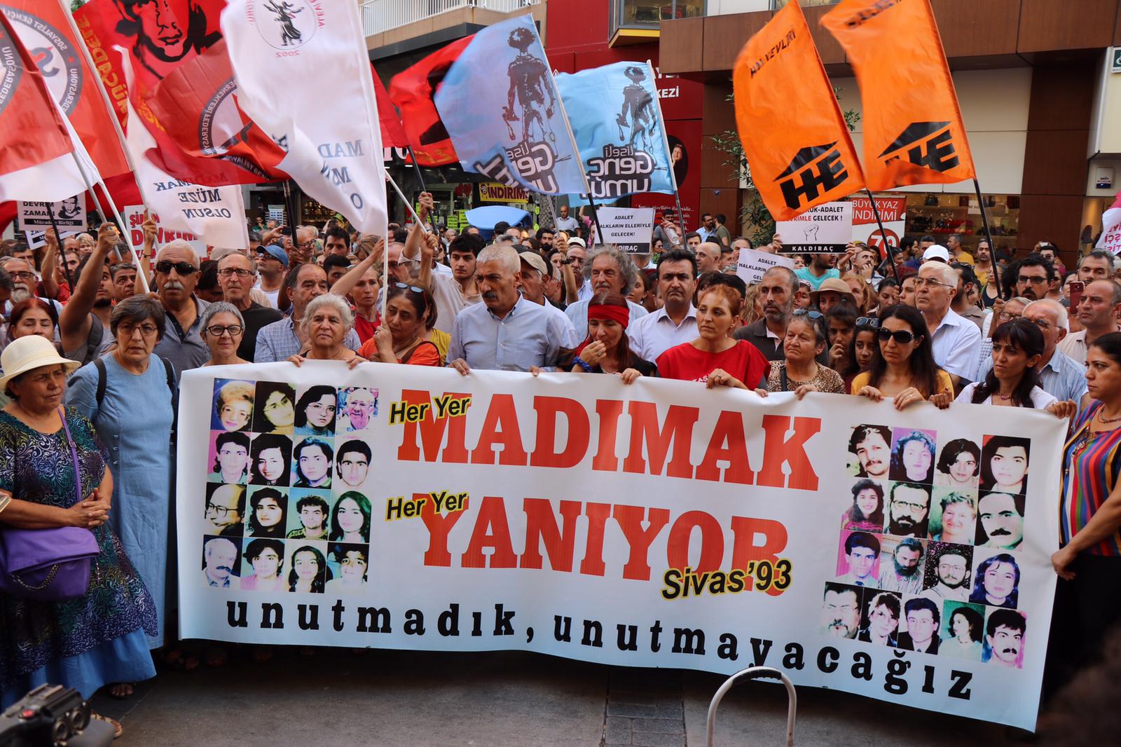 Açıklamada, Sivas Katliamı’nı gerçekleştirenlerin AKP tarafından milletvekili, bakan hatta Anayasa Mahkemesi üyesi yapılarak adeta ödüllendirildiklerinin altı çizildi.