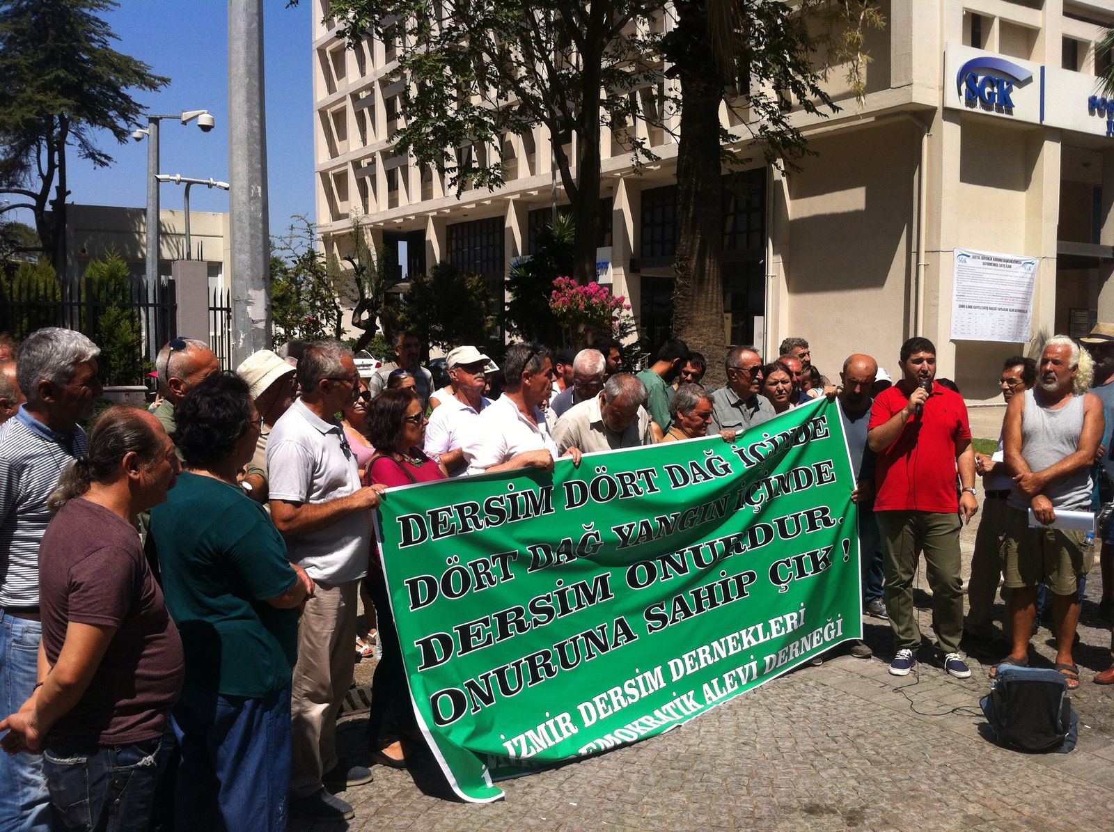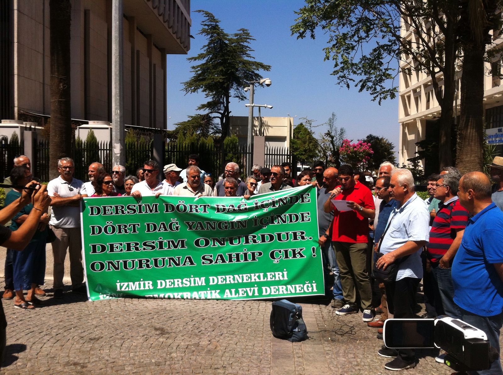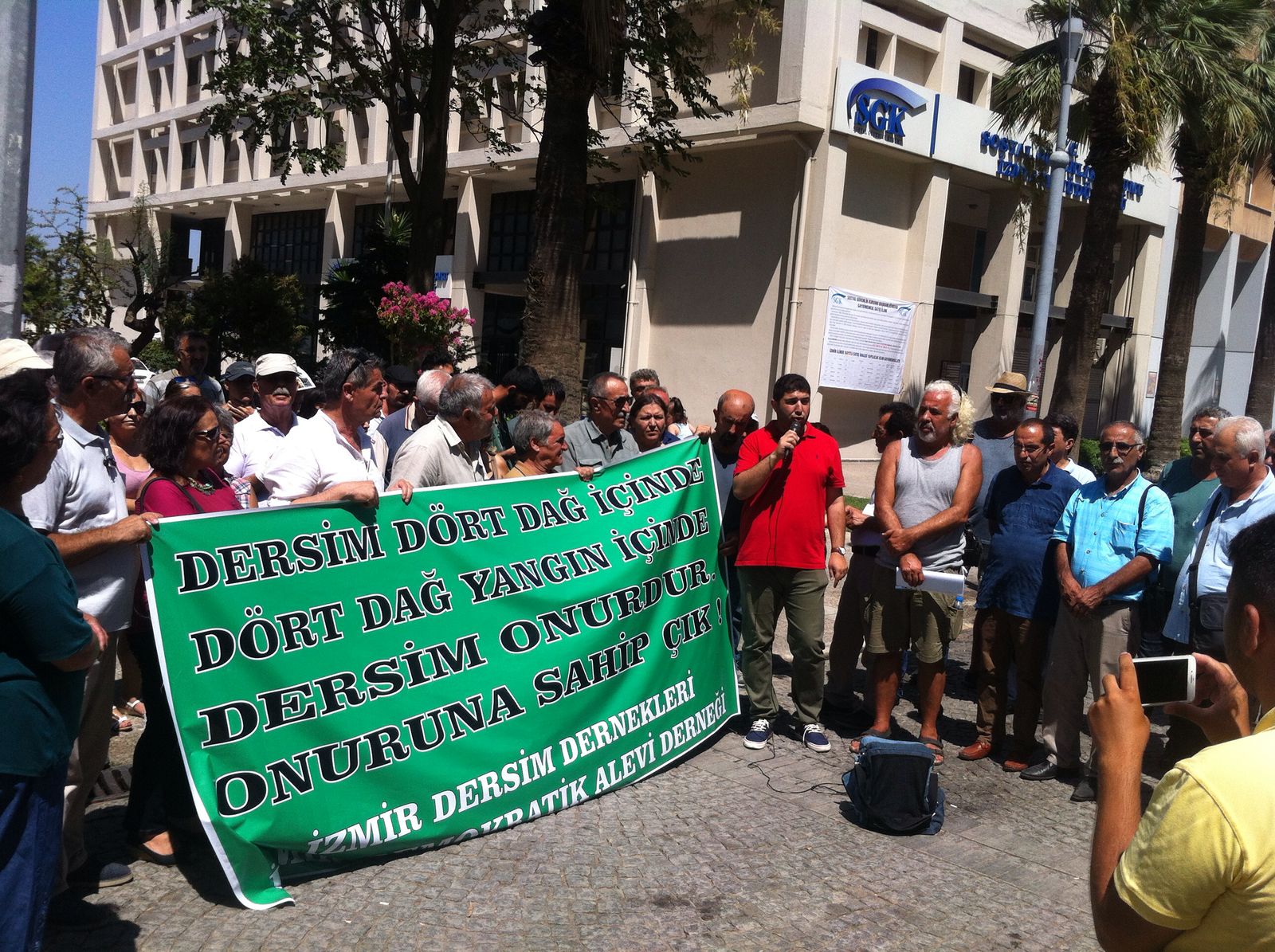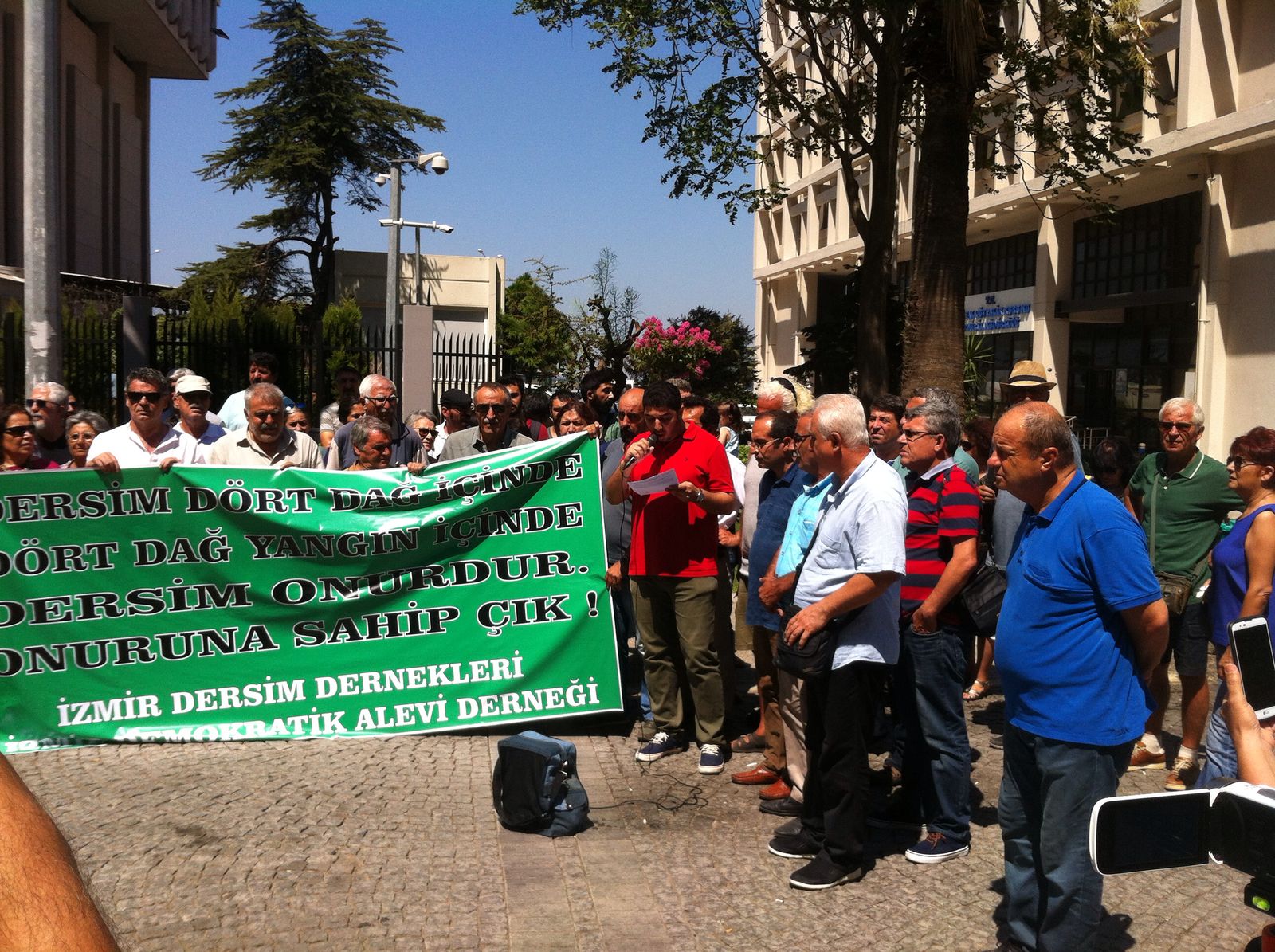 Dersim’deki orman yangınlarına ilişkin İzmir Sümerbank önünde gerçekleşen açıklamaya Demokratik Alevi Dernekleri ve Dersimliler Derneği’nin basın açıklamasına Narlıdere ve Balçova Cemevleri, İnsan Hakları Derneği, Eğitim-sen, Alevi Bektaşi Federasyonu ABF İzmir bileşenleri, BDSP, HDP Milletvekili Müslüm Doğan ve yurttaşlar katıldı.