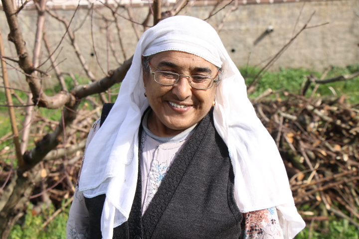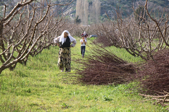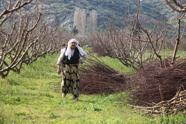 25 yıl önce ekmeğinin peşinden Batman’dan İzmir’in Selçuk ilçesine göç eden Gülnaz Elitok‘u budanan şeftali ağaçlarının çalılarını toplarken görüntülüyoruz.