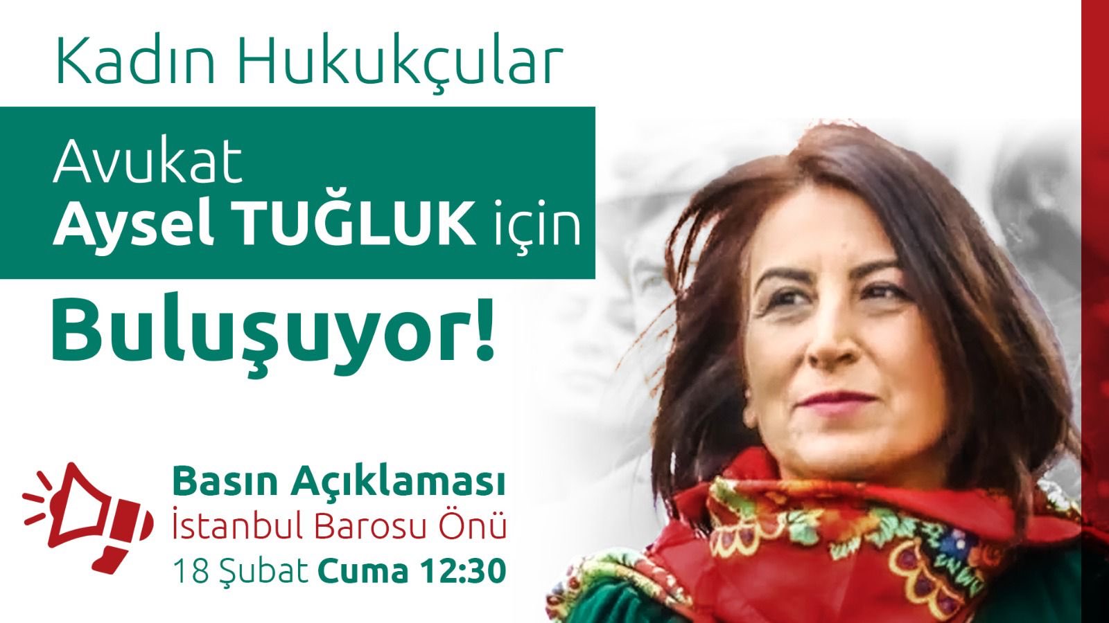 Kadın avukatlar, Tuğluk için İstanbul’da bir araya gelecek. 18 Şubat Cuma günü İstanbul Barosu önünde buluşacak olan avukatlar saat 12.30’da basın açıklaması yapacak.