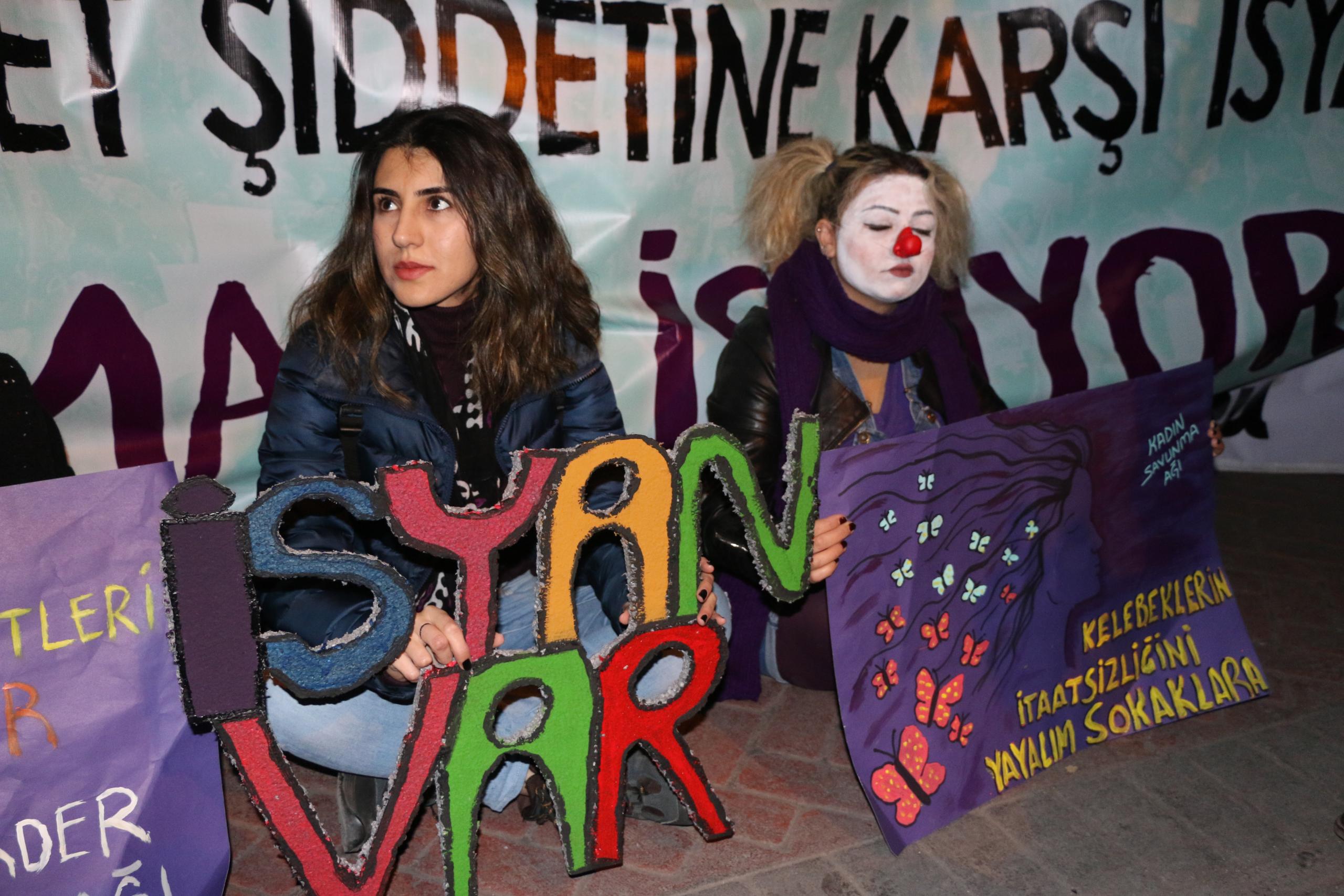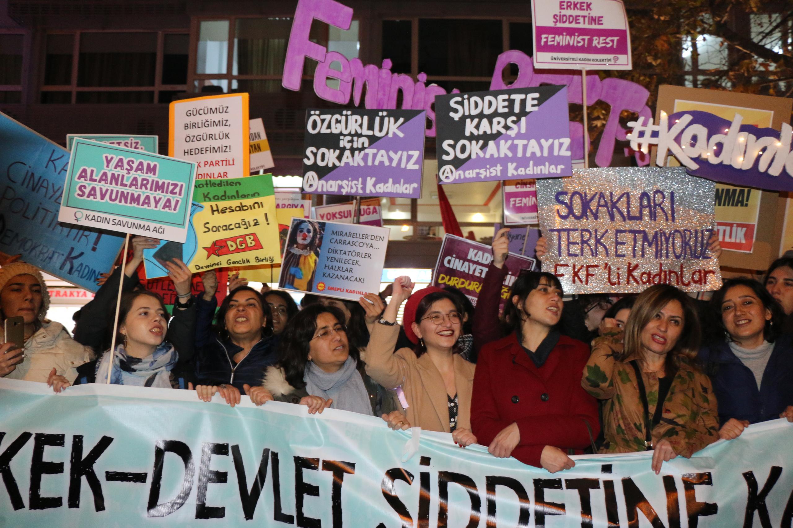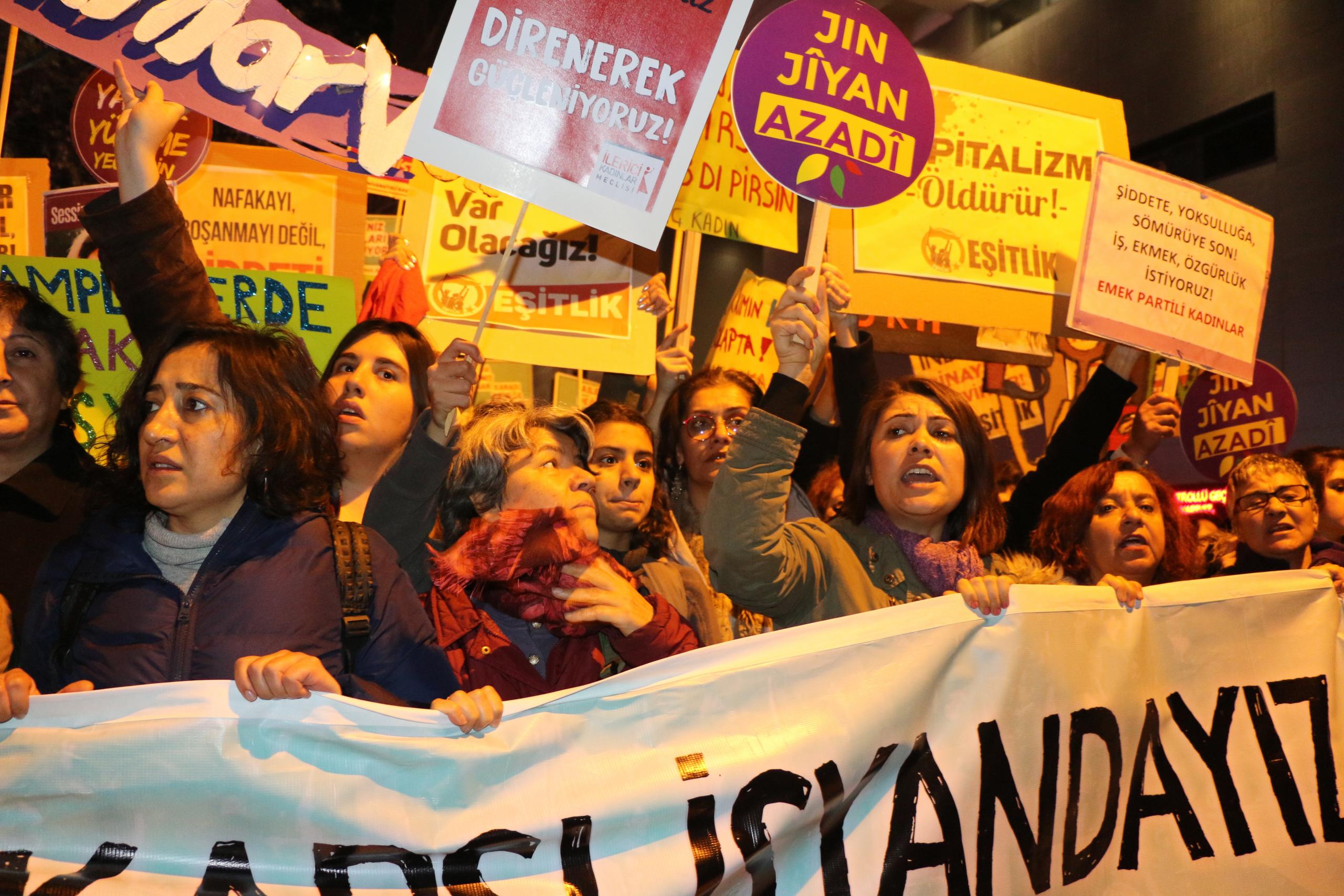 “Şiddet karşısında önleyici, koruyucu önlemler içeren 6284 sayılı kanun ve İstanbul Sözleşmesi’ni hedef alan, tecavüzcü ve istismarcılara affı gündem eden, kadını değil aileyi koruyan politikalarla karşımıza çıkan, sözde ‘mağdur erkekler’ yaratarak nafaka hakkımıza saldıran, doğayı sermaye sahiplerinin ellerine bırakan, ucuz, güvencesiz, esnek çalışma şartlarıyla ve işsizlikle emeğimizi sömüren AKP iktidarına, ‘Kadına yönelik şiddet abartılıyor’ diyen bakanına karşı bugün, 25 Kasım’da sokaklardayız.”