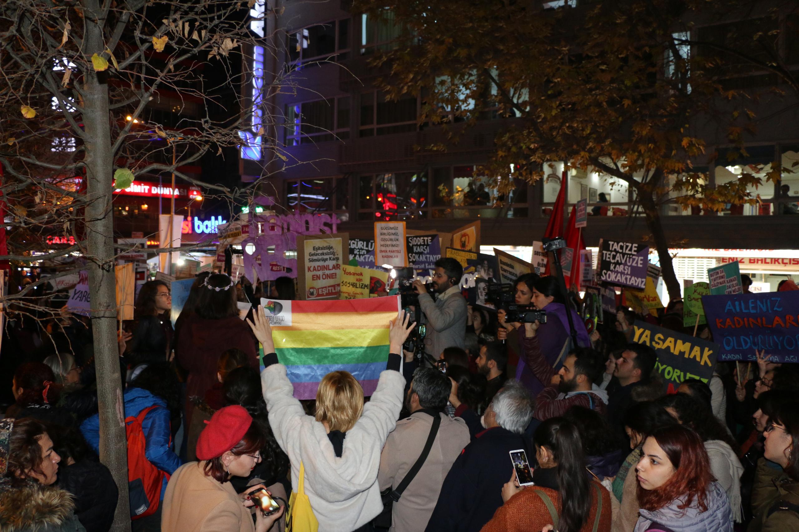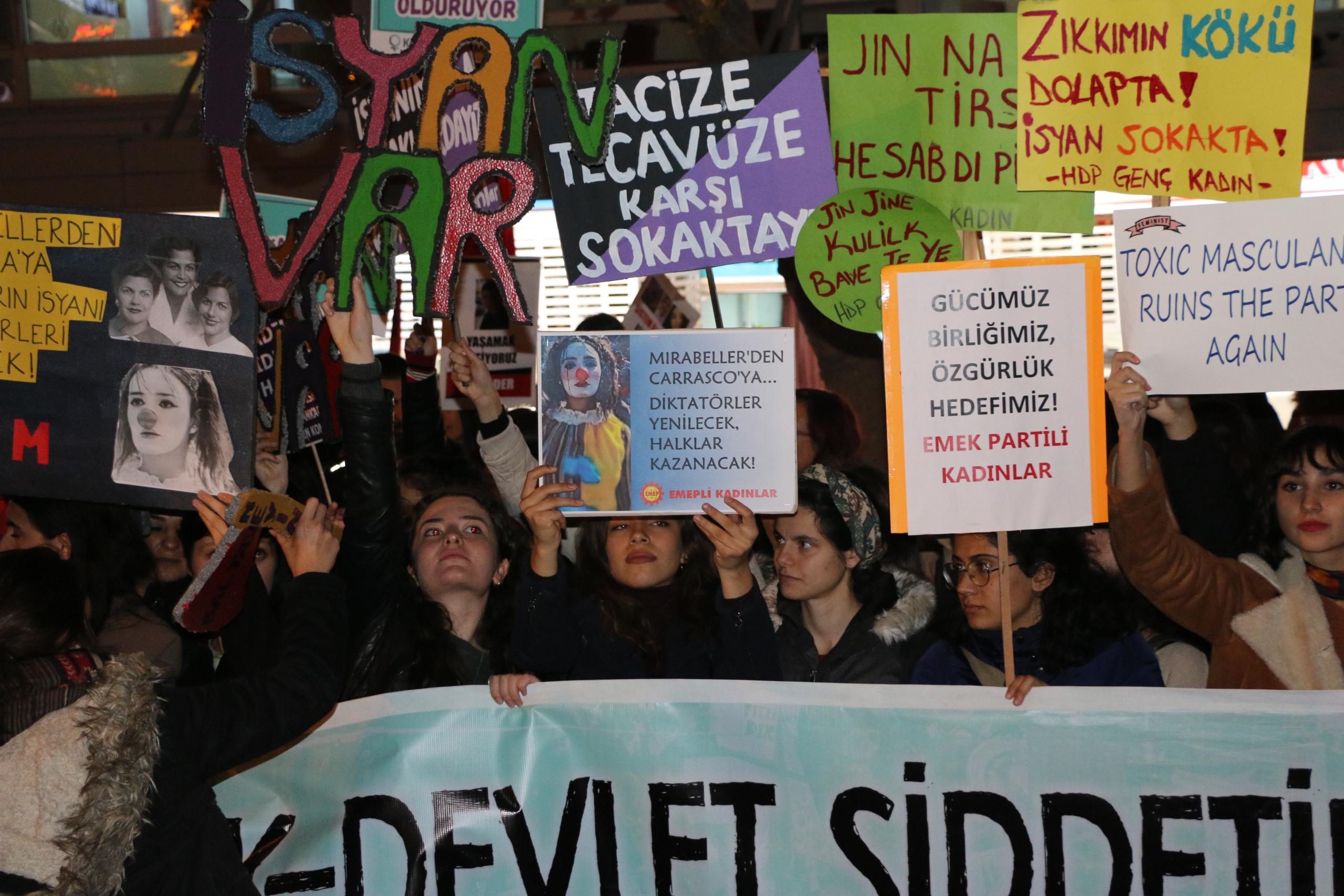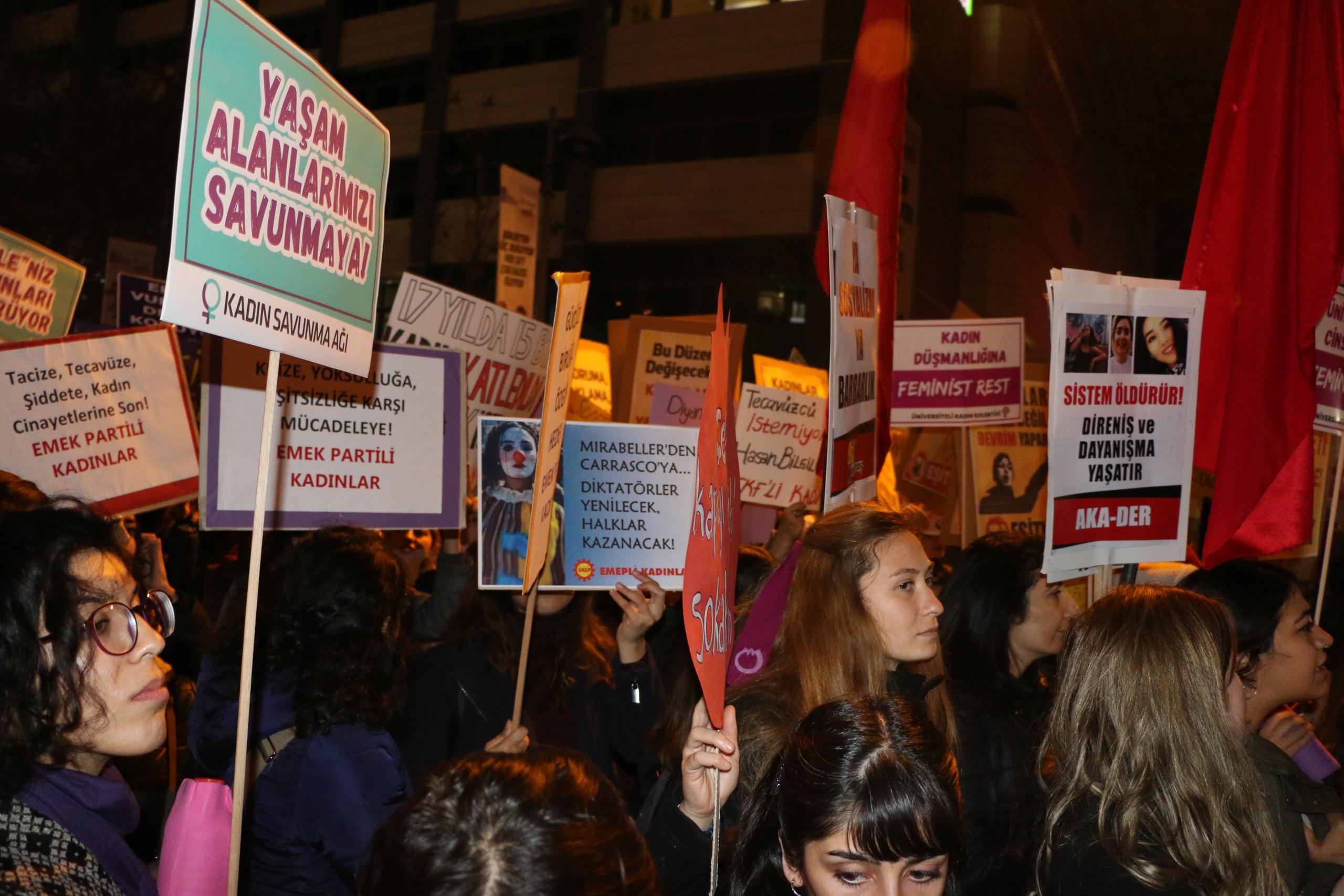 “Şiddet karşısında önleyici, koruyucu önlemler içeren 6284 sayılı kanun ve İstanbul Sözleşmesi’ni hedef alan, tecavüzcü ve istismarcılara affı gündem eden, kadını değil aileyi koruyan politikalarla karşımıza çıkan, sözde ‘mağdur erkekler’ yaratarak nafaka hakkımıza saldıran, doğayı sermaye sahiplerinin ellerine bırakan, ucuz, güvencesiz, esnek çalışma şartlarıyla ve işsizlikle emeğimizi sömüren AKP iktidarına, ‘Kadına yönelik şiddet abartılıyor’ diyen bakanına karşı bugün, 25 Kasım’da sokaklardayız.”