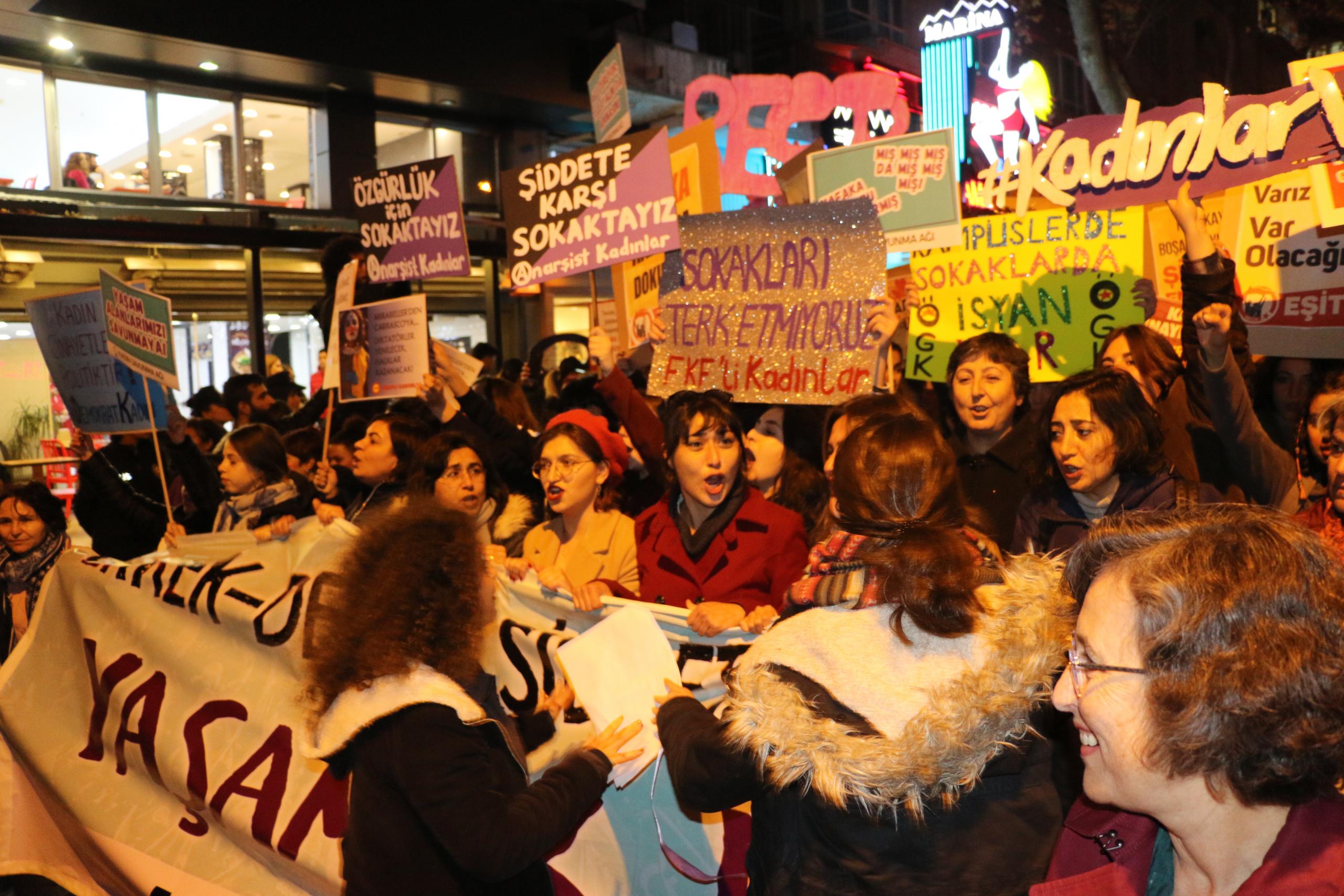 Bu kararlılıkla bugün ülkenin her yerinde şehir meydanlarını kadınların kahkahasıyla, isyanıyla doldurduk. Bizler gibi dünyanın her yerinde direnen kadınların mücadelesini selamlıyoruz: Bolivya’da, Şili’de, Lübnan’da, Beyrut’ta, İran’da ve Rojava’da sokakta yaşamları için dövüşen kadınlara binlerce selam olsun! Hayatın her alanında mücadele etmeye devam edeceğiz. Erkek egemenliğine, kapitalizme, faşizme, emperyalizme karşı kentleri kadınların isyanı ile saracak, kelebek etkisi yaratacağız.”