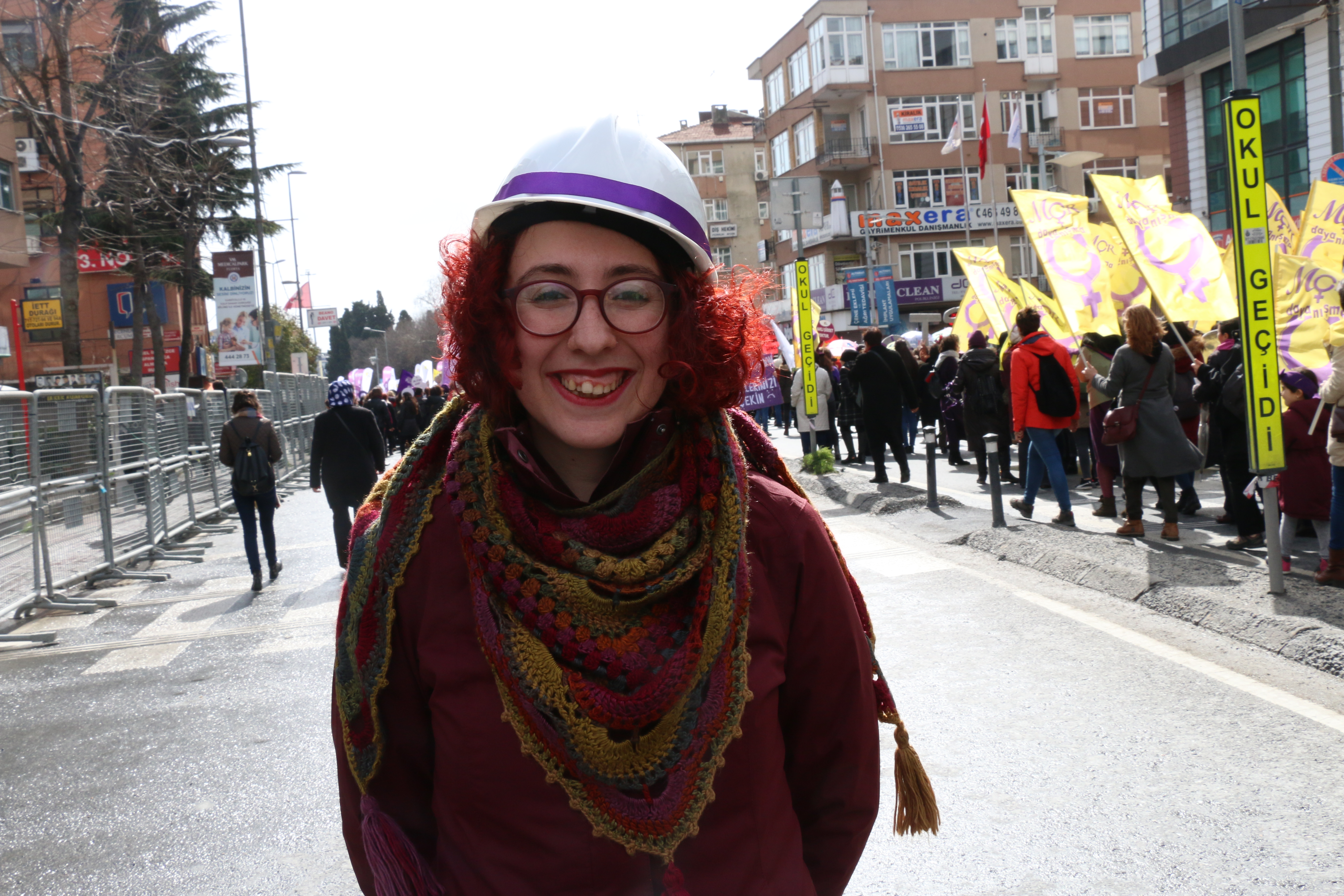 Başında kasketiyle gelen Selin Tok da, “TMMOB’lu kadınlar olarak geldik eyleme. saldırıların bu kadar arttığı dönemde eşit işe eşit ücret için çıktık alanlara. Artık yeter diyoruz. 8 Mart’taki feminist yürüyüşünde de alanlarda olacağız. Tüm şiddete rağmen kadınlar sokaklarda ve kadınlar birlikte güçlüyüz. Ve biz kazanacağız, diyoruz. Daha parlak günlerde gökkuşağının hakim olduğu günlerde barış içinde yaşayacağız” dedi.
