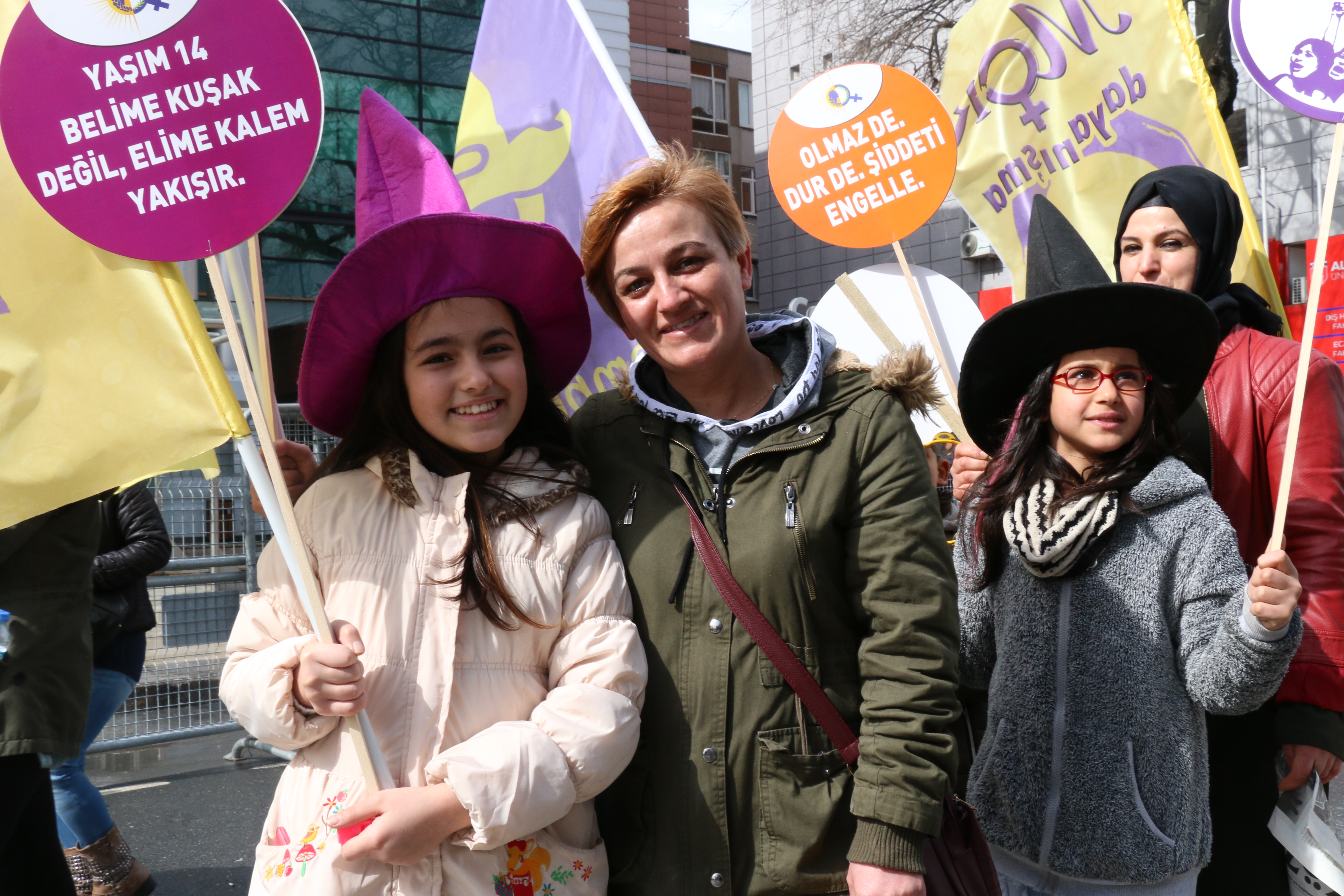Sabiha Bahar kızı ile birlikte gelmiş eyleme. 9 yaşındaki kızı, “Kadın özgürlüğü için buradayız annemle birlikte” dedi. (HABER MERKEZİ)