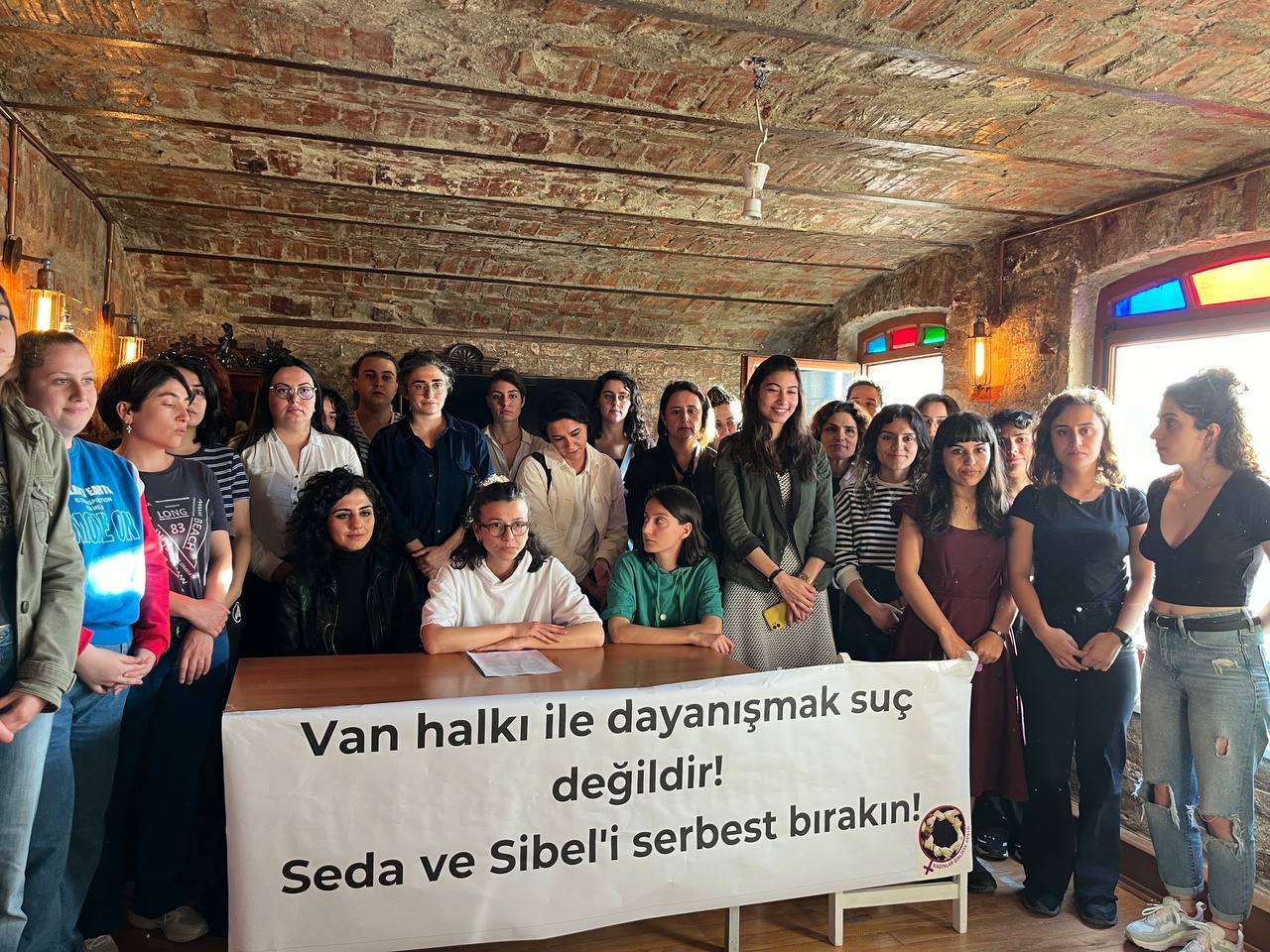 Kadınlar Birlikte Güçlü (KBG) Van’daki irade gaspı girişimine yönelik İzmir’de düzenlenen eylemde gözaltına alındıktan sonra tutuklanan ve cezaevinde iradenin keyfi uygulamaları, tehdit ve baskılarına maruz bırakılan Kampüs Cadıları üyesi Sedanur Uğur ve Mor Dayanışma üyesi Sibel Örkmez için Beyoğlu’nda bulunan Mor Dayanışma derneğinde basın toplantısı gerçekleştirdi. Toplantının gerçekleştiği salona “Van halkı ile dayanışmak suç değildir. Seda ve Sibel’i serbest bırakın” pankartı asıldı. Açıklamayı İrem Kayıkçı, okudu.