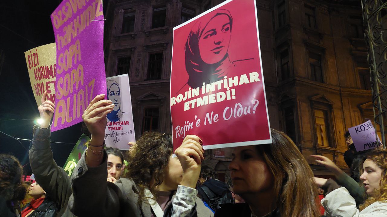 Binlerce kadın yurttaş, “Kadınlar İsyanda, Tarikat düzeninizi yıkacağız. Erkek devlet şiddetine son” yazılı dövizlerin yanı sıra katledilen Rojin Kabaiş’in fotoğraflarını da taşıdı.
