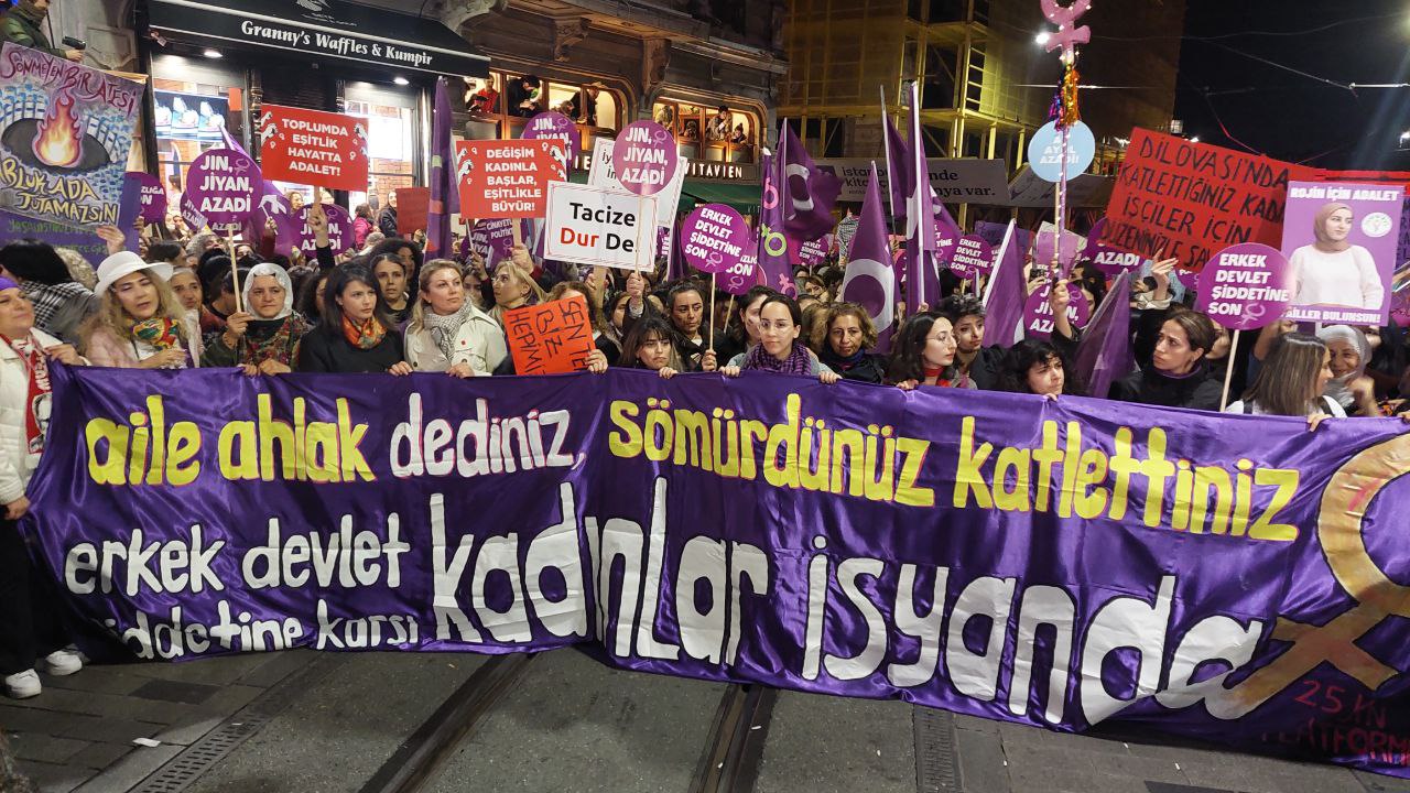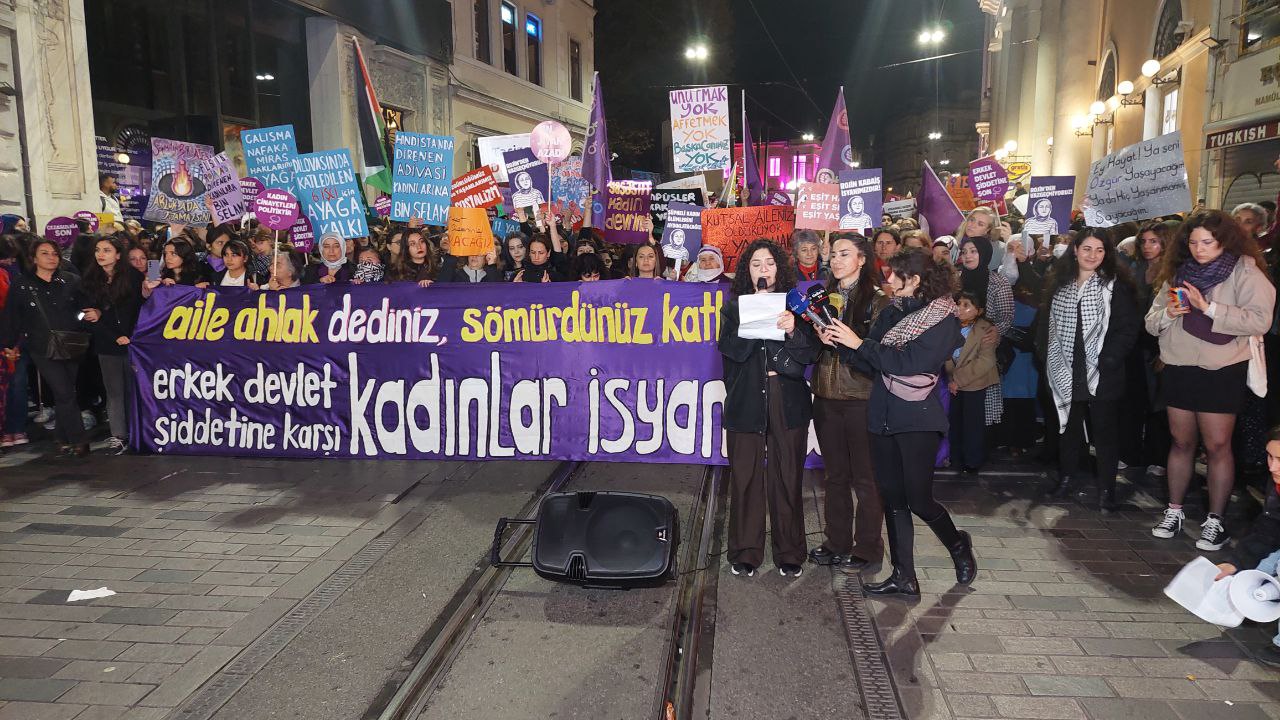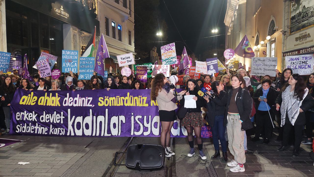 “Başvurduğumuz karakollarda diyorlar ki; ‘kocandır, idare et.’ Uzaklaştırma kararları uygulanmıyor. Gizlilik sağlanmadığı için kadınlar öldürülüyor. Önleyici politikalar uygulanmıyor, fail erkekler cezasızlıkla ödüllendiriliyor. Ve artık kadın cinayetleri kadar şüpheli kadın ölümlerini de konuşuyoruz. Yüzlerce kadının ölümü ‘intihar’ ya da ‘şüpheli’ denilerek karartılıyor. Gülistan Doku’ya ne oldu? Nadira’nın, Hande’nin, Dina’nın, Rojin’in, Rabia Naz’ın, Narin’in ölümü neden aydınlatılmıyor? Erkeklerin, kamu görevlilerinin, siyasetçilerin, ailelerin suç ortağı olduğu her cinayet, üstü örtülen her ölüm, bir sonraki şiddetin zeminini hazırlıyor. Bu iktidar LGBTİ+ düşmanı! Bu iktidar ahlakçı! Yargı paketleriyle ‘genel ahlak’ ve ‘biyolojik cinsiyet’ adı altında kadınları, LGBTİ+’ları, çocukları hedef alıyor. Transların bedenlerine ilişkin karar hakkı baskılanıyor, LGBTİ+ varoluşları kriminalize edilmek isteniyor. Eşitsizliğe, ayrımcılığa, nefrete karşı en yüksek sesimizle, dayanışmamızla buradayız. 25 Kasım’ı yasaklayan, kadınları yerlerde sürükleyerek gözaltına alan, ters kelepçe ile işkence eden, karakollarda çıplak arama işkencesine maruz bırakan, sokaklarda barikat kurup sesimizi kısmaya çalışan bir düzenle karşı karşıyayız. Bu şiddet, tıpkı erkek şiddeti gibi hayatlarımızı kontrol altına almaya çalışan aynı iktidar anlayışının ürünüdür.”