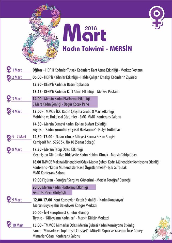3 Mart saat 14:00’da kadın şenliği, 4 Mart saat 14:30’da hukukçu-aktivist Hülya Gülbahar’ın katılımıyla, Mersin Cemevi’nde “Kadın sorunları ve yasal haklarımız” konulu panel gerçekleştirilecek.