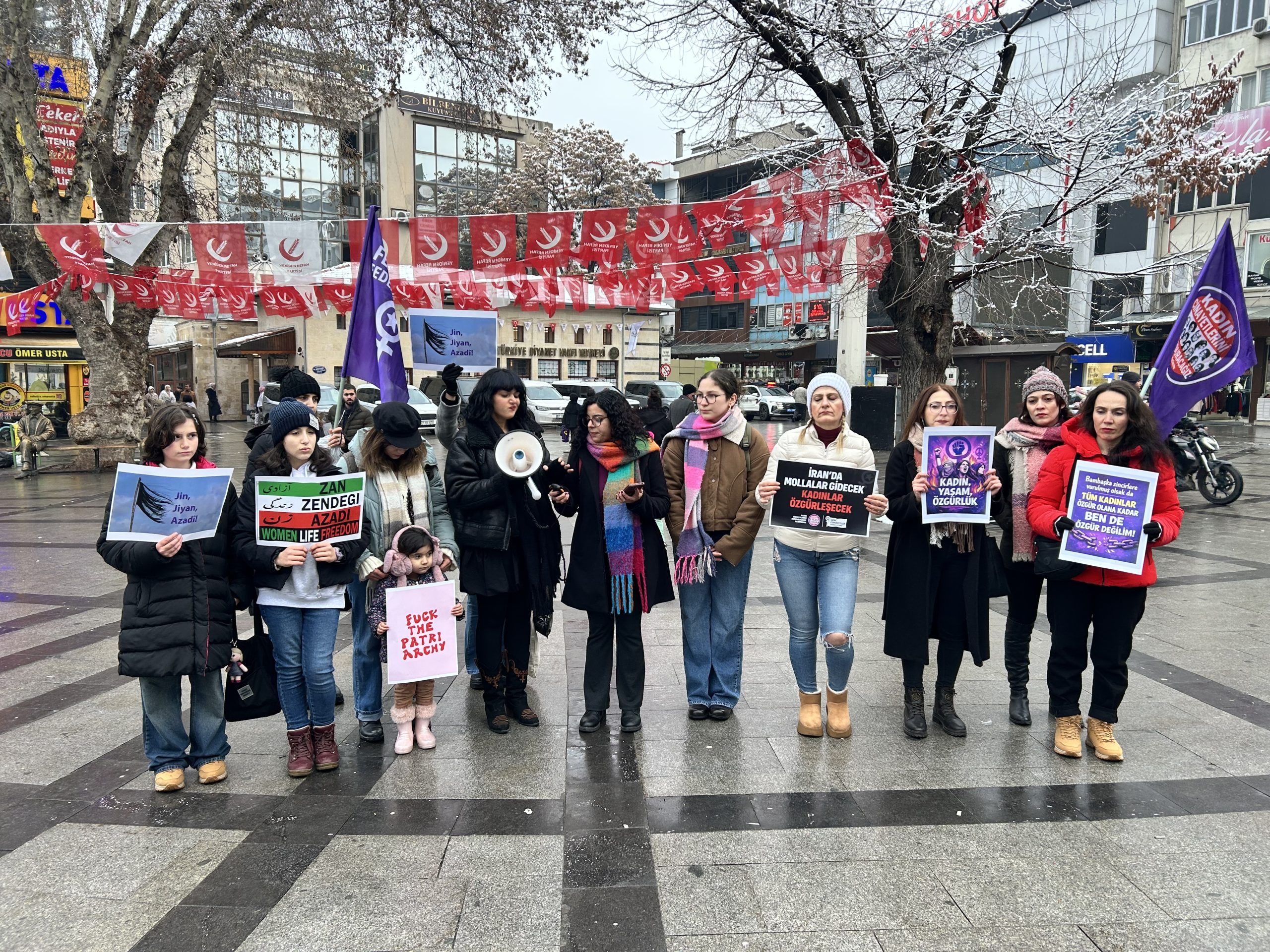 “Kadınlar, gençler, direnenler öldürülüyor. Kaç kişinin öldürüldüğünü bile bilmiyoruz, çünkü rejim gerçeği saklıyor. Biz burada İran’daki yoldaşlarımızın sesi olmak için toplandık. Direnişlerinde yanlarındayız. Bedenlerimiz hakkında karar vermek kimsenin haddi değil.”