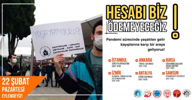 Sosyal medya hesaplarından eylem duyurusunu yapan Kafe-bar Çalışanları Dayanışması, “Çifte standart sürüyor. Emekçiler hayatını kaybederken kongre ve mitingler tam gaz devam ediyor. Pandeminin hesabını bize yıkmaya çalışanlar yanılıyor, hesabı biz ödemeyeceğiz. 22 Şubat Pazartesi günü hep birlikte itirazımızı yükselteceğiz, sen de gel!” ifadelerini kullandı.
