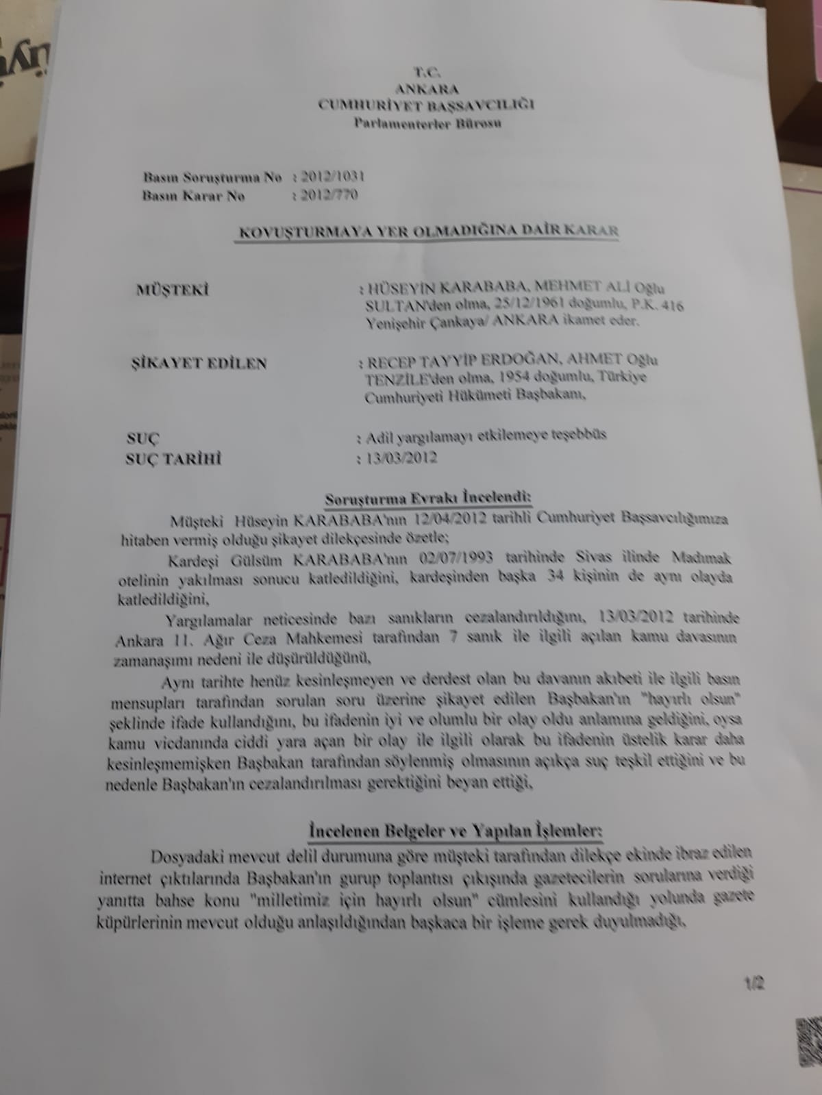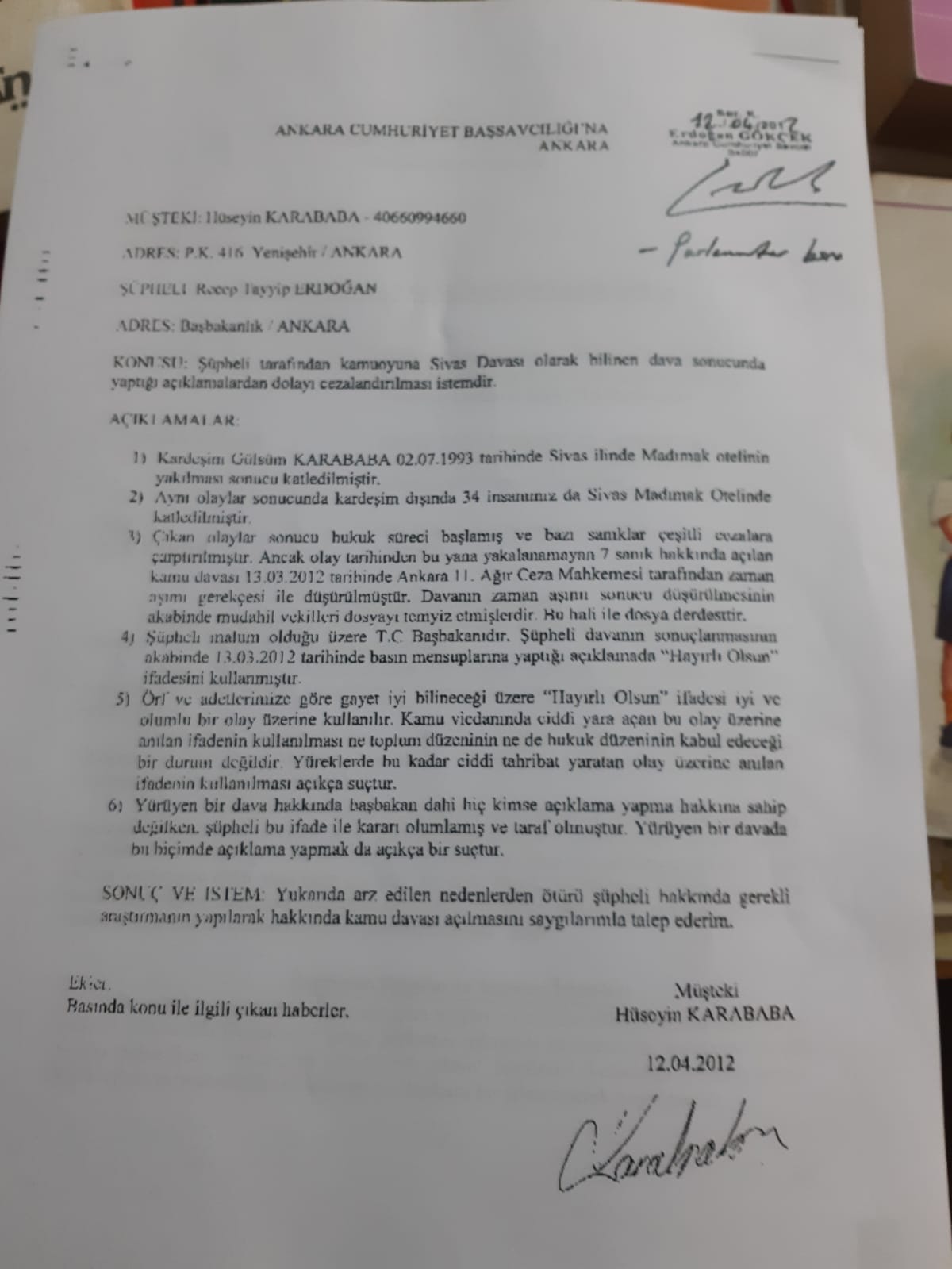 “13 Mart 2012’de 1. Ağır Ceza Mahkemesi -o dönem 11. Ağır Ceza Mahkemesiydi- 7 kişi hakkında zaman aşımı verdi. Bunların içerisinde Cafer Erçakmak’ta var. O gün Recep Tayyip Erdoğan Başbakandı, mikrofon uzattılar, ‘Hayırlı uğurlu olsun’ dedi. Şimdi şöyle adam yirmi yıl aranmış ama hiç yakalanmamış, ceza da yatmamış. Dolaşması serbestleştirilmiş oldu. Başbakan olarak bunlara ‘Hayırlı uğurlu olsun’ dedi. Ben 12 Nisan 2012’de bir basın açıklaması ile birlikte Recep Tayyip Erdoğan hakkında bir dava açtım. Hayırlı uğurlu olsun demek düğün, bayram, nişan vesairesi olanlara denir. Peki bunlara, bu haydutlara, bu yamyamlara, hayırlı uğurlu olsun da benim anama ne olacak? Bize ne olacak? Bize ne diyorsun, Başbakansın sen!