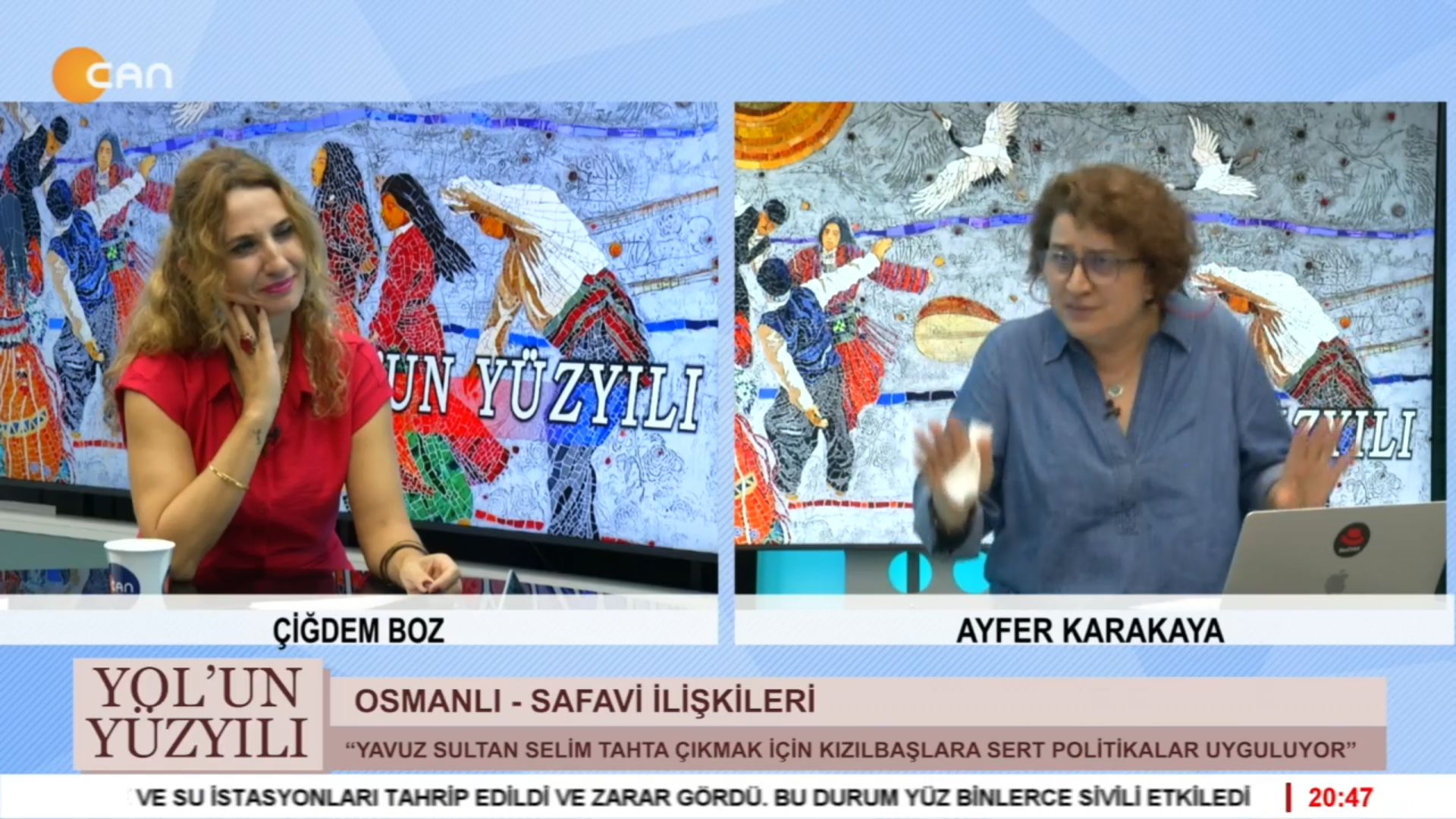 Prof. Dr. Çiğdem Boz’un sunumuyla CANTV’de yayınlanan Yolun Yüzyılı programına Doç. Dr. Ayfer Karakaya konuk oldu. Programın üçüncü bölümünde “Osmanlı döneminde Alevilerin sözlü ve yazılı kültürü”, “Alevilik ve Vefailik arasındaki ilişki”, “Osmanlı Devleti’nin Aleviler ile ilişkisi” ve “Osmanlı-Safavi ilişkileri” konuşuldu.
