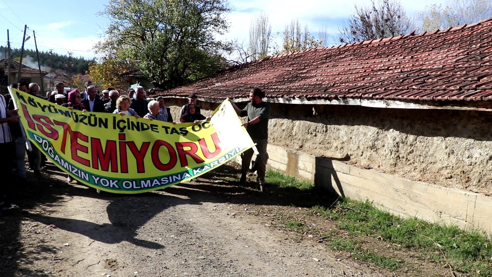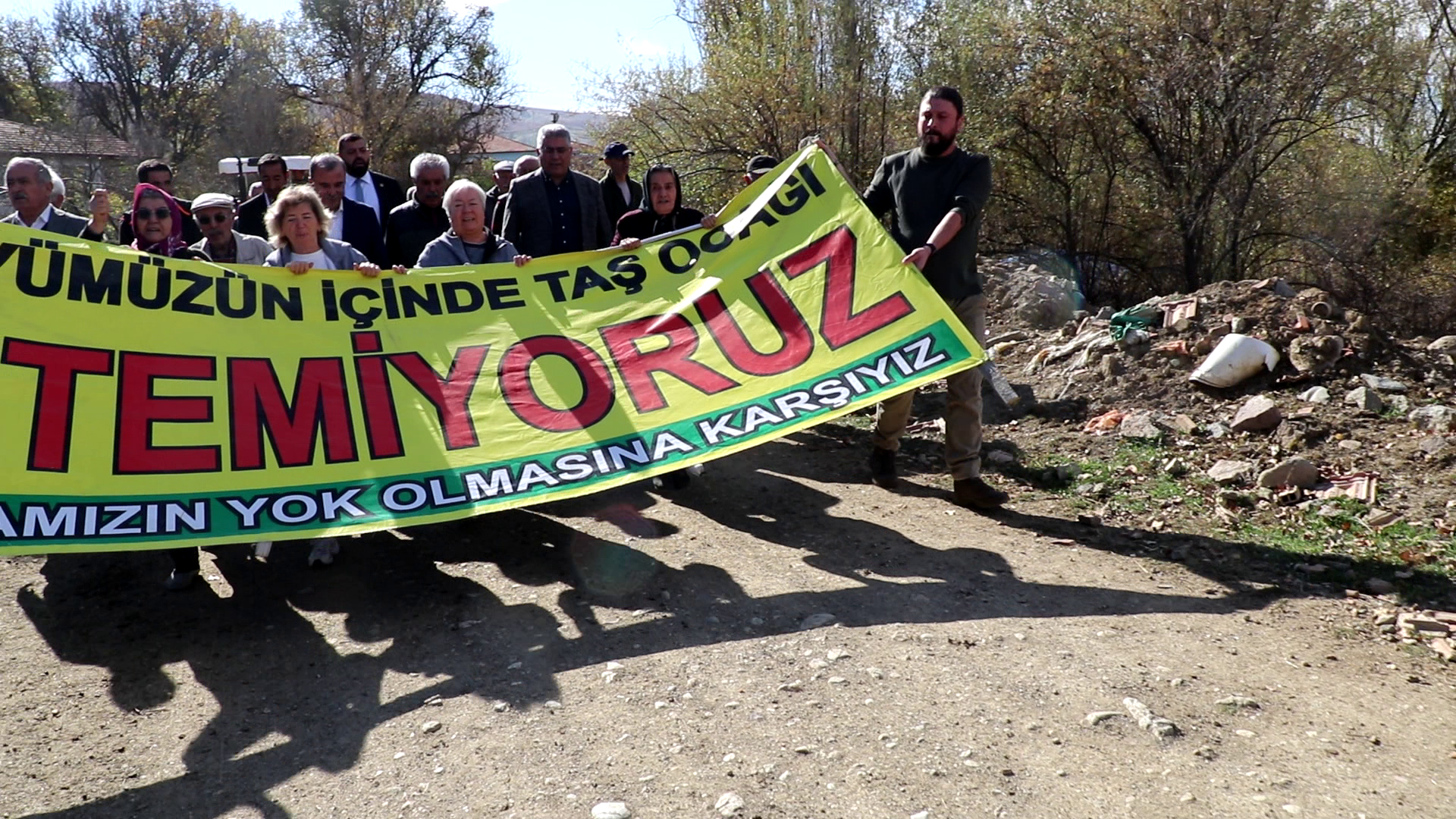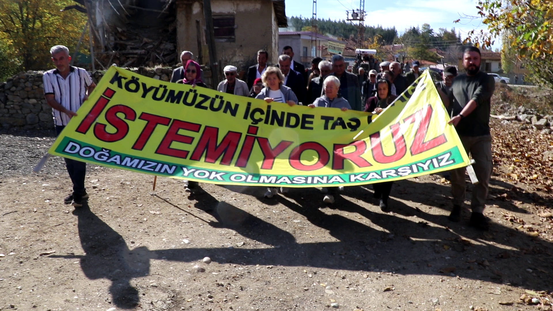 Çelikler Holding, Ankara-Samsun hızlı tren hattı projesinin yapımında kullanmak için Çorum’un Sungurlu ilçesine bağlı Karakaya köyünde taş ocağı ve kırma-eleme tesisi açmak istiyor. Köyün tarım ve hayvancılık alanını tehdit eden proje Karakayalı’lar tarafından yürütmeyi durdurma talebiyle mahkemeye taşınırken, devam eden yargı sürecine rağmen Çelikler Holding bölgede şantiye kurarak çalışmalara başladı. Karakaya halkı, tarım alanlarına uzak bir bölgeyi alternatif olarak önerdiklerini fakat şirketin kabul etmediğini aktaran Karakaya halkı, planlanan taş ocağını protesto etmek için Karakaya Muhtarlığı’nın önünden yürüyüş düzenledi. “Direne direne kazanacağız”, “Çelikler Holding köyümüzden defol” sloganlarının atıldığı yürüyüşün ardından Karakaya’lılar, iş makinalarının önünde açıklama gerçekleştirdi.