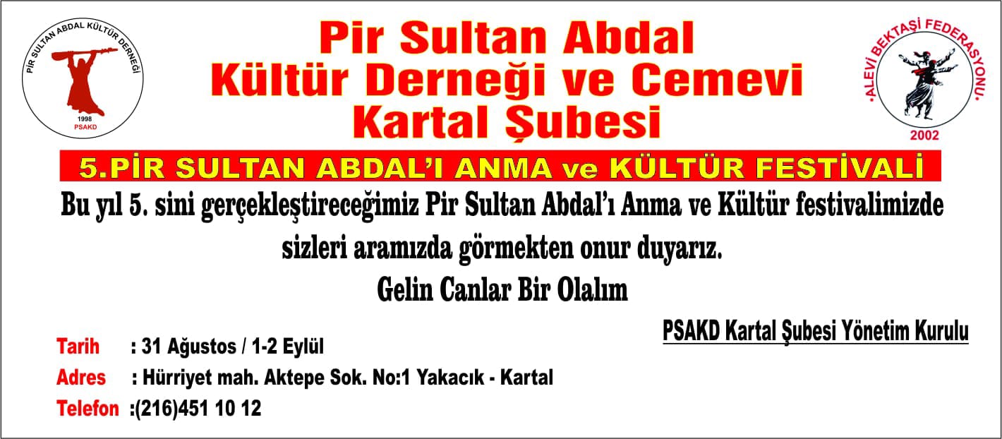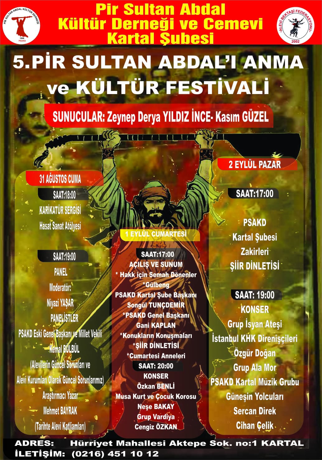 Pir Sultan Abdal Kültür Derneği Kartal Şubesi Cemevi, 5. Pir Sultan Abdal’ı Anma ve Kültür Festivali programını açıkladı. 31 Ağustos Cuma günü başlayacak festival, üç gün sürecek. Zeynep Derya Yıldız İnce ve Kasım Güzel’in sunuculuğunu yapacağı festival programı şöyle: