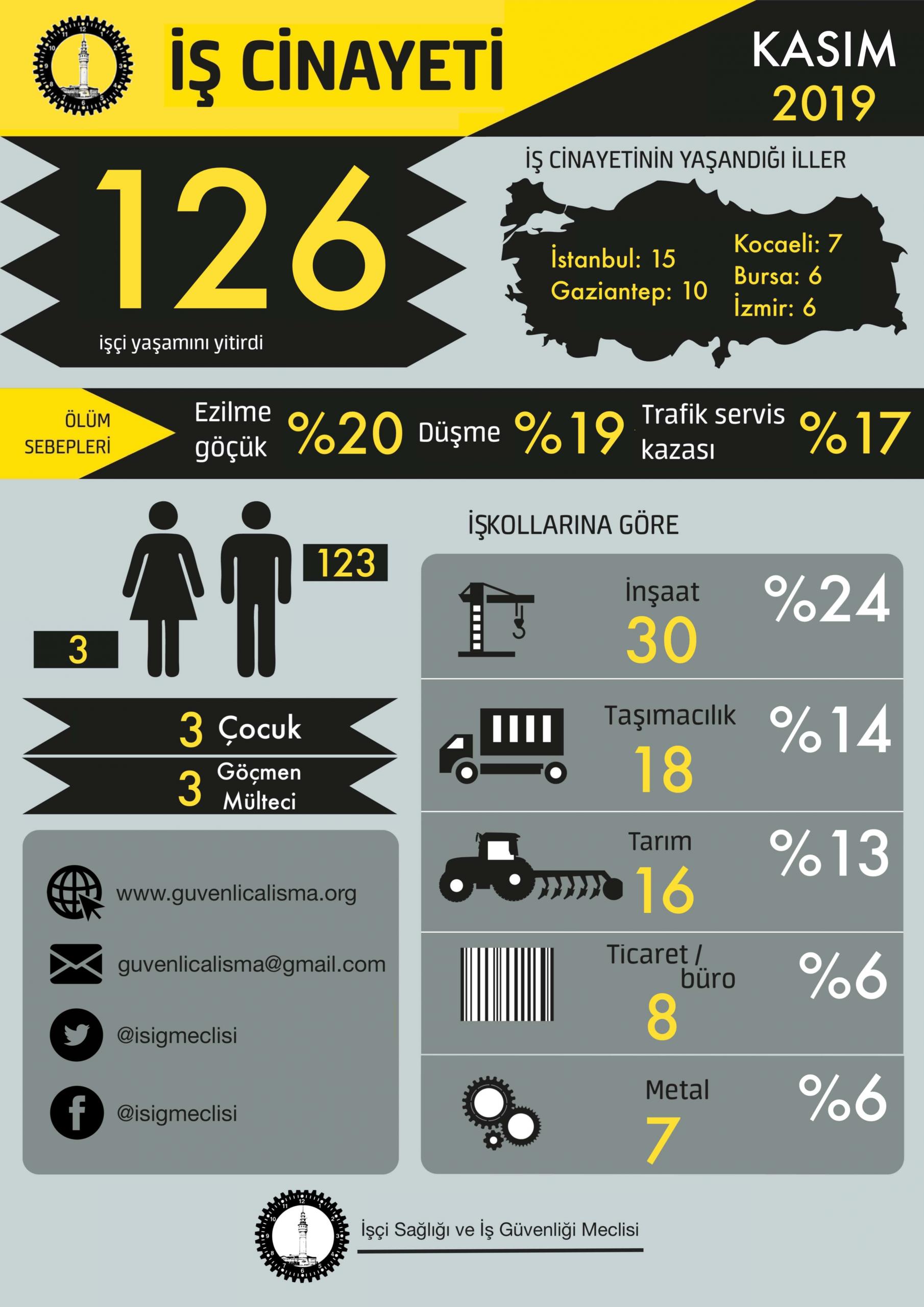 İSİG, Kasım ayı iş cinayetleri raporunu açıkladı. Toplanan veriler doğrultusunda Kasım’da en az 126 işçinin iş cinayetlerinde yaşamını yitirdi açıklandı.