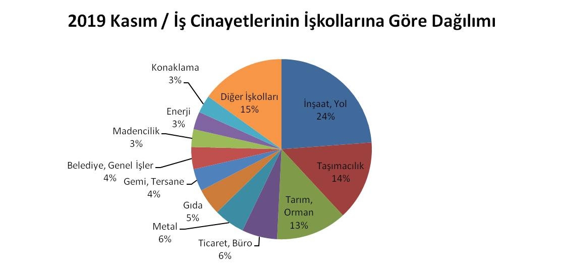 İSİG raporunda ölümlerin en çok inşaat, taşımacılık, tarım, ticaret/büro, metal, gıda, gemi/tersane, belediye/genel işler, madencilik, enerji ve konaklama işkollarında gerçekleştiği açıklanırken Kasım’da en çok ölümün tarım sektöründe olduğu vurgulandı.