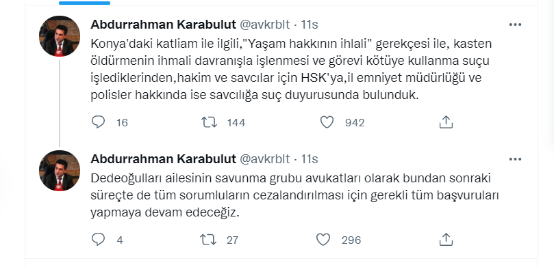 Konya’nın Meram ilçesinde Dedeoğulları ailesinden 7 kişinin yaşamını yitirdiği ırkçı katliamla ilgili yürütülen soruşturma devam ederken, ailenin avukatı Abdurrahman Karabulut, twitter hesabından konuya ilişkin yeni bir paylaşım yaptı.
