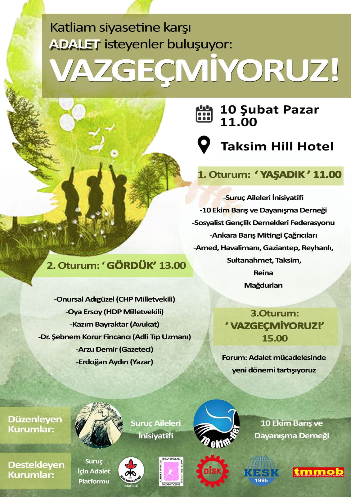 Katliam siyasetine karşı adalet isteyenler “Vazgeçmiyoruz” şiarıyla İstanbul Taksim Hill Otel’de buluşuyor. 10 Şubat Pazar günü saat 11.00’de başlayacak olan program 3 oturum şeklinde devam edecek.