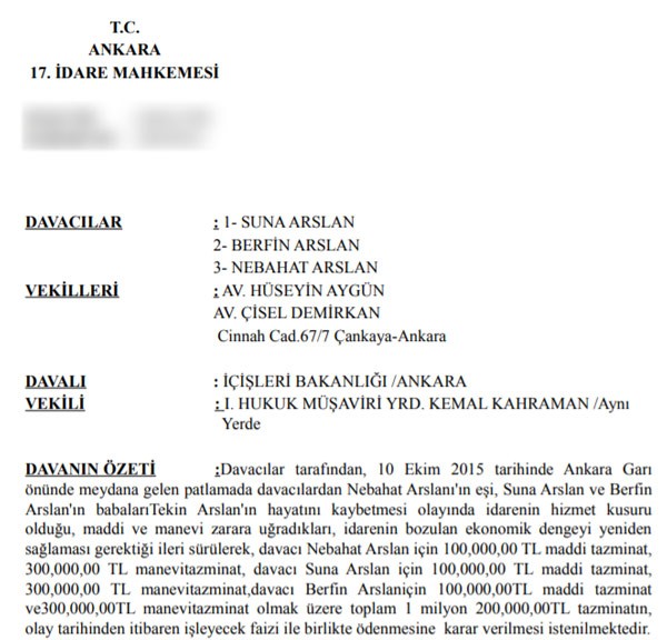 Odatv’de yer alan habere göre IŞİD’in saldırısında hayatını kaybeden inşaat işçisi Tekin Arslan için; eşi Nebahat Arslan ile çocukları Suna Arslan ve Berfin Arslan bir dava açtı.