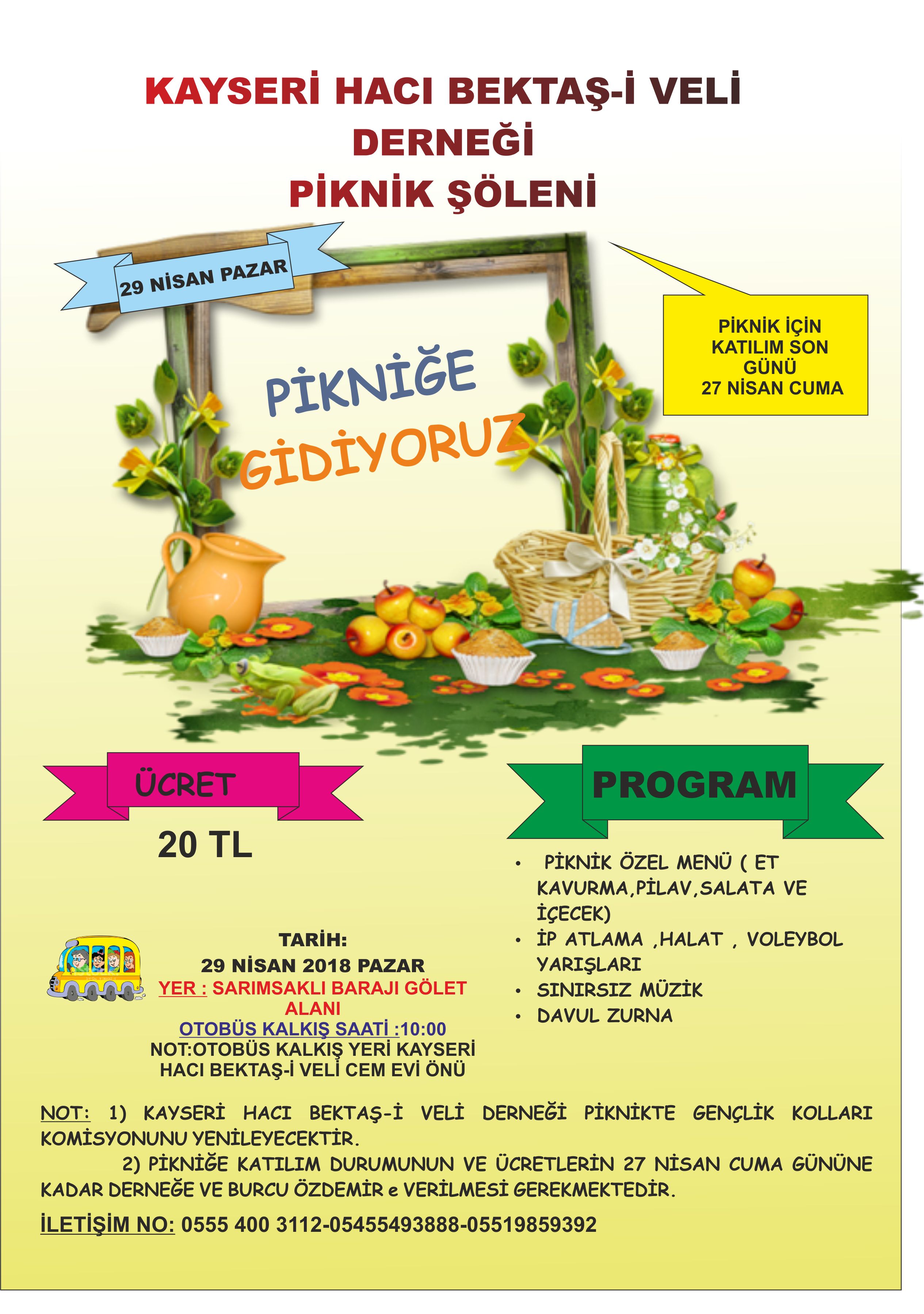 Kayseri Hacı Bektaş-i Derneği, piknik şöleni düzenliyor. 29 Nisan Pazar günü Sarımsaklı Barajı Gölet Alanı’nda düzenlenecek olan piknik için derneğin önünden araçlar kaldırılacağı duyuruldu.