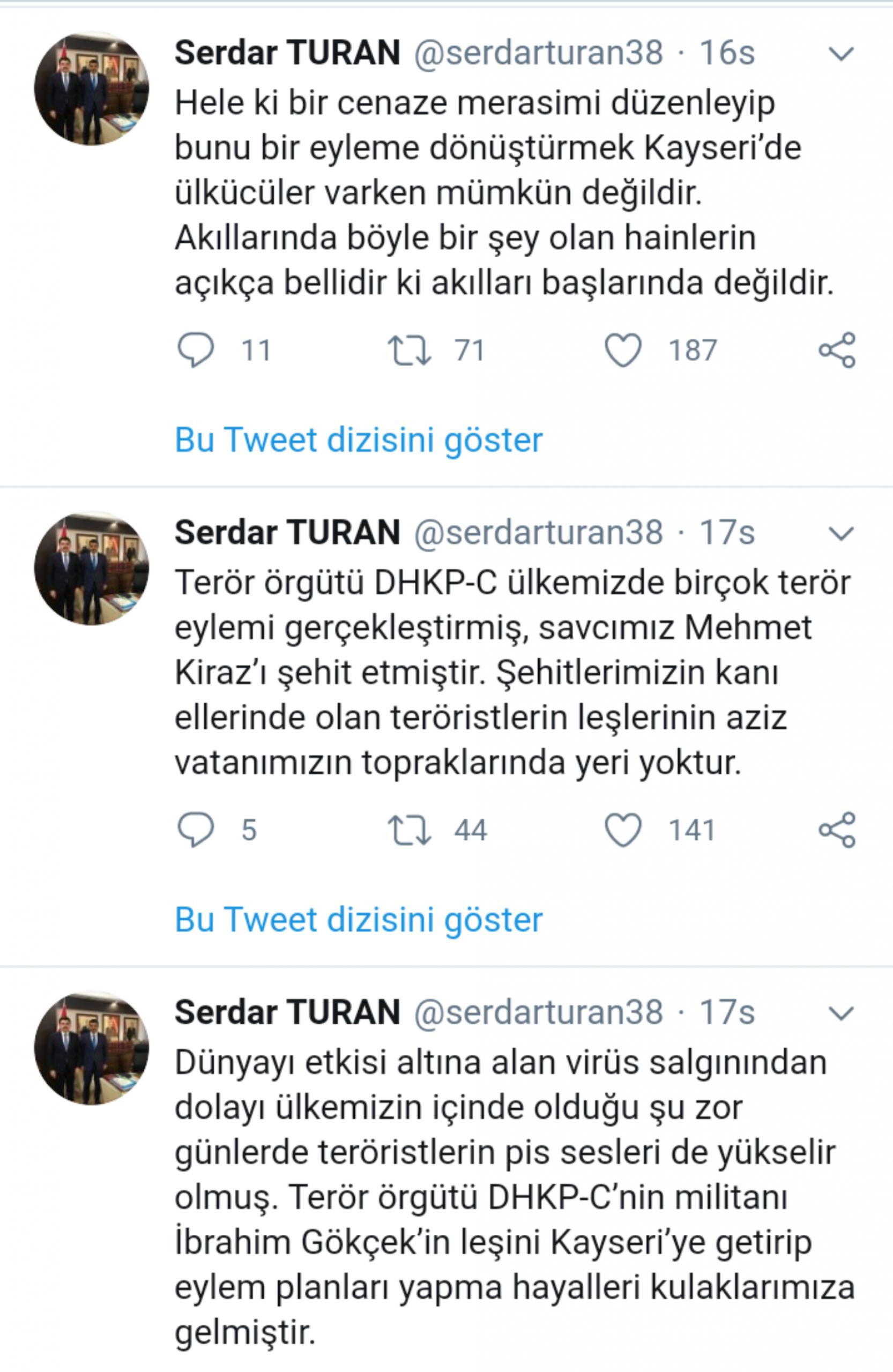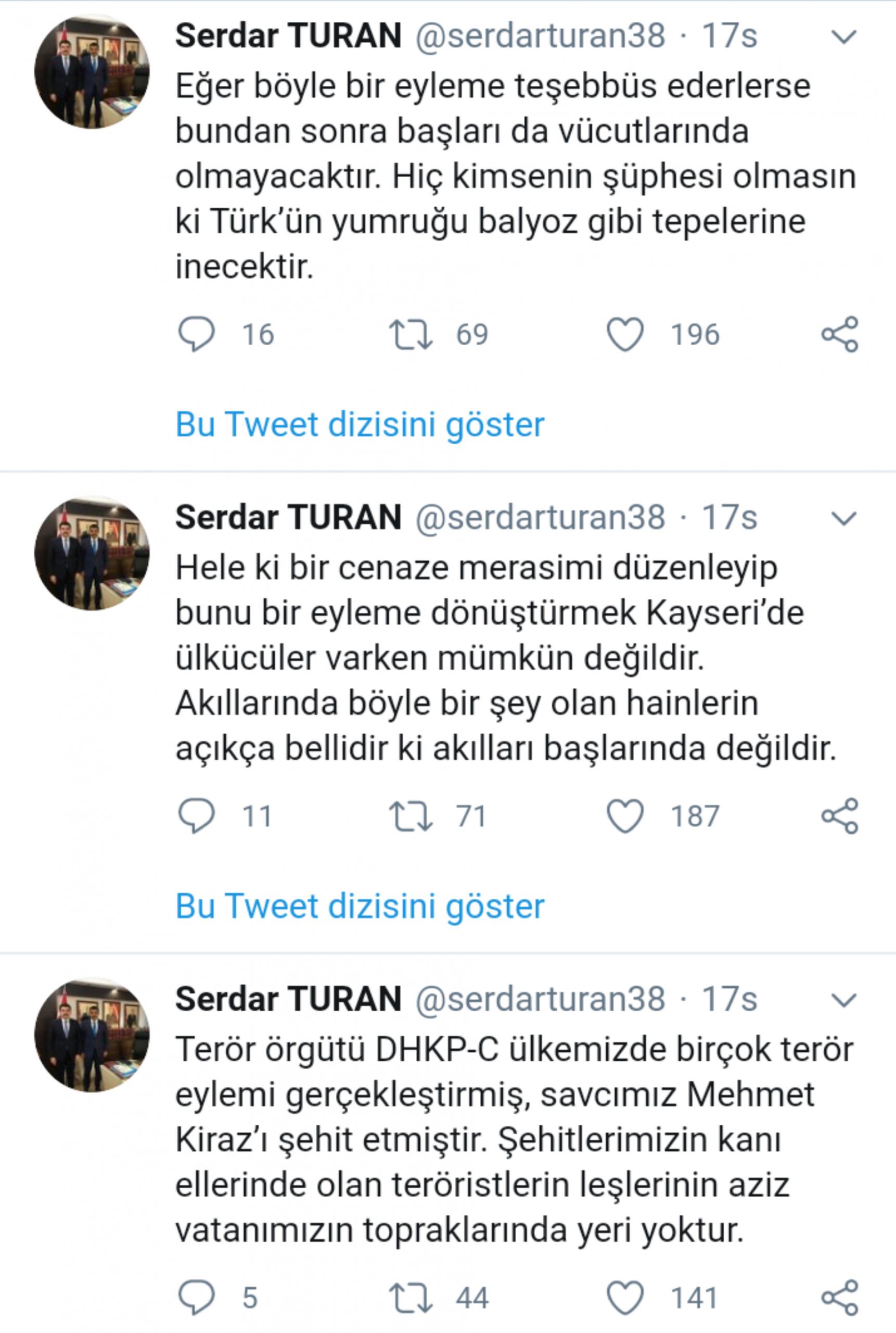 İbrahim Gökçek’in cenazesinin Kayseri’ye getirilmesi öncesi ise Kayseri Ülkü Ocakları Başkanı sosyal medyadan tehdit mesajı yayımladı. Kayseri Ülkü Ocakları Başkanı Serdar Turan, Gökçek’in cenazesinin Kayseri’ye getirilmesini ve cenaze töreni düzenlenmesini engelleyeceklerini belirtip, “Eğer böyle bir eyleme teşebbüs ederlerse bundan sonra başları da vücutlarında olmayacaktır. Hiç kimsenin şüphesi olmasın ki Türk’ün yumruğu balyoz gibi tepelerine inecektir” ifadelerini kullandı.