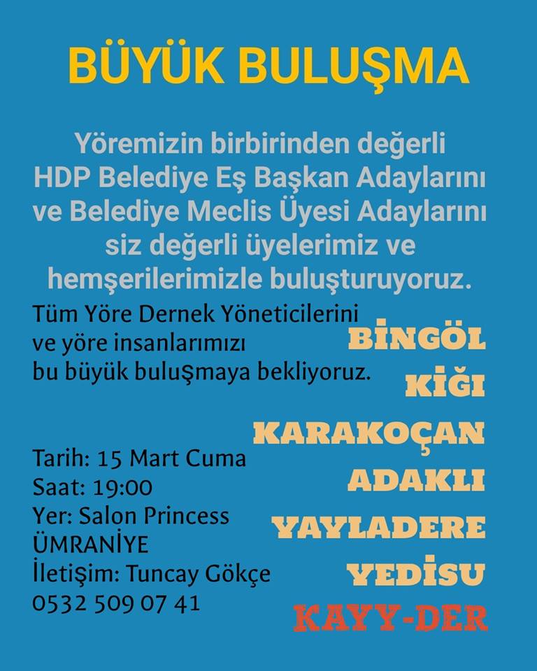 KAYY-DER İstanbul’da Bingöl adaylarına destek amacıyla dayanışma gecesi düzenliyor. 15 Mart Cuma günü saat 19.00’da Ümraniye Salon Princess’de yapılacak geceye HDP belediye eş başkan adayları, belediye meclis üyesi adayları halk ile bir araya gelecek.