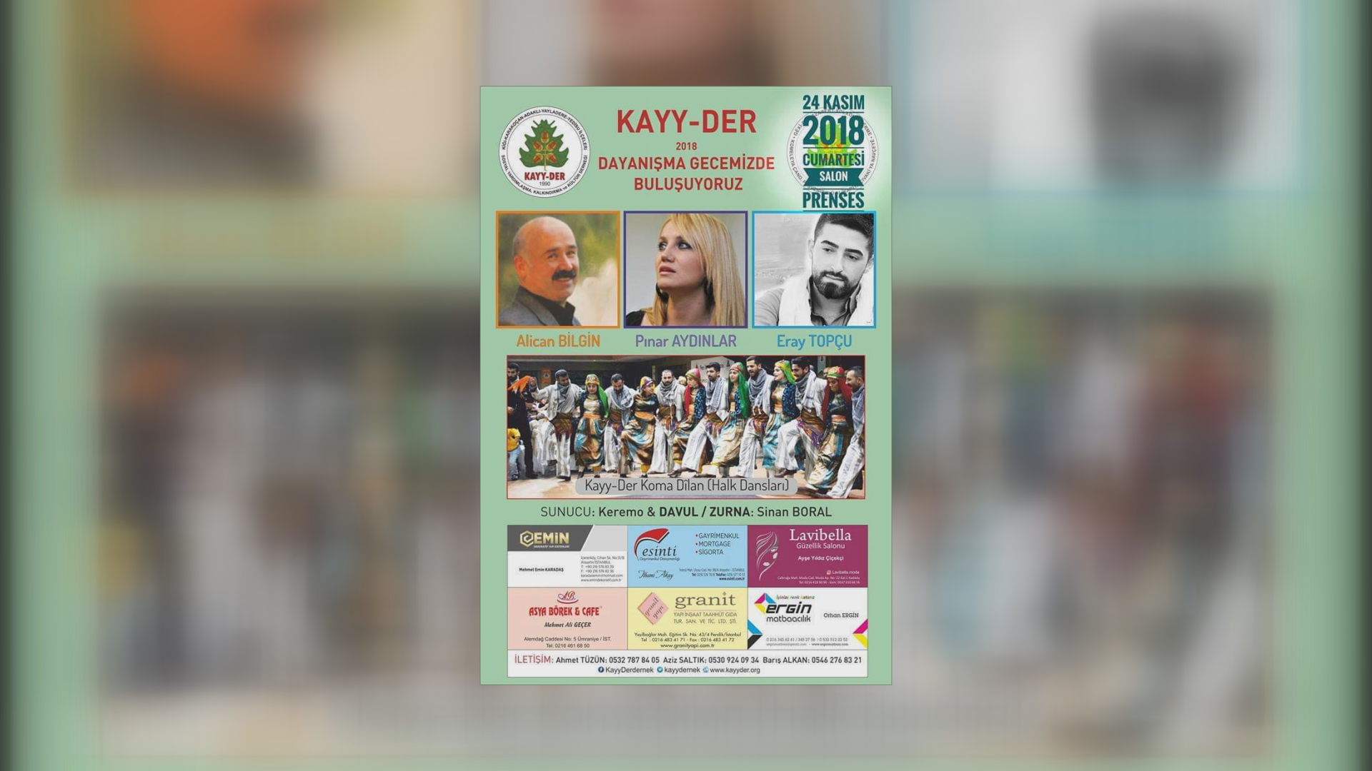 Kiği, Karakocan, Adaklı, Yayladere, Yedisu İlçeleri Sosyal Yardımlaşma Kalkındırma ve Kültür Derneği (KAYY-DER) üyeleri İstanbul’da düzenlenecek olan dayanışma gecesinde bir araya gelecek. 24 Kasım Cumartesi günü Prenses salonda düzenlenecek olan dayanışma gecesine Alican Bilgin, Pınar Aydınlar ve Eray Topçu katılacak. Gecede KAYY-DER Koma Dilan grubu halk oyunları gösteri yapacak. (HABER MERKEZİ)