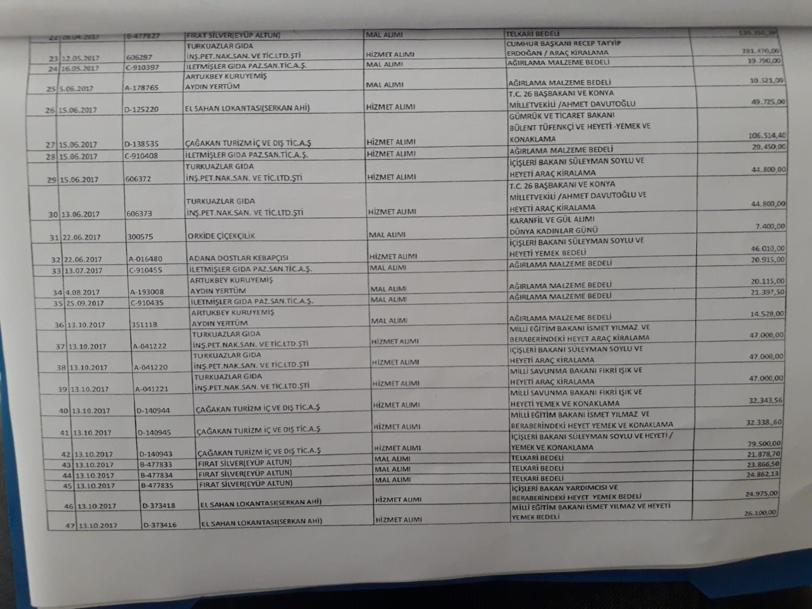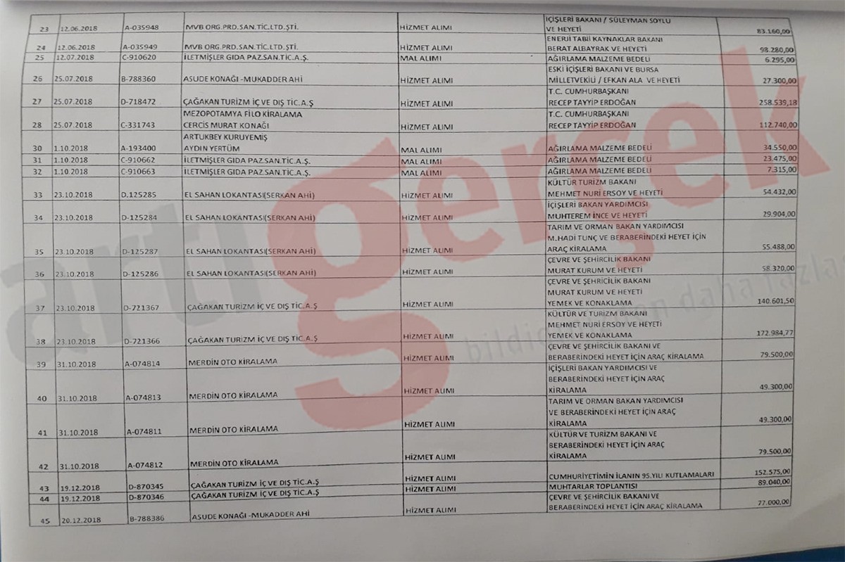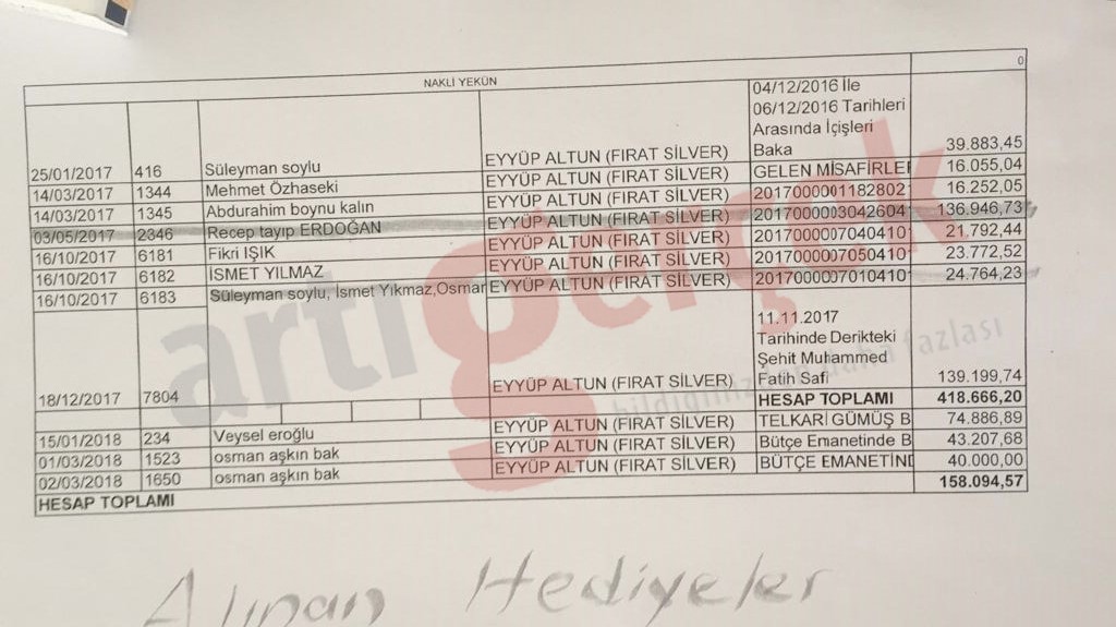 Artı Gerçek, AKP’li Cumhurbaşkanı Recep Tayyip Erdoğan, İçişleri Bakanı Süleyman Soylu, eski bakanlar İsmet Yılmaz, Fikri Işık, Veysel Eroğlu, 31 Mart yerel seçimlerinde Ankara Büyükşehir Belediye Başkanı Mansur Yavaş’ı yolsuzluk iddiasıyla suçlayan AKP’nin adayı Mehmet Özhaseki ve çok sayıda ismin alınan ‘hediyelerin’ bedellerinin olduğu belgeye ulaştı.