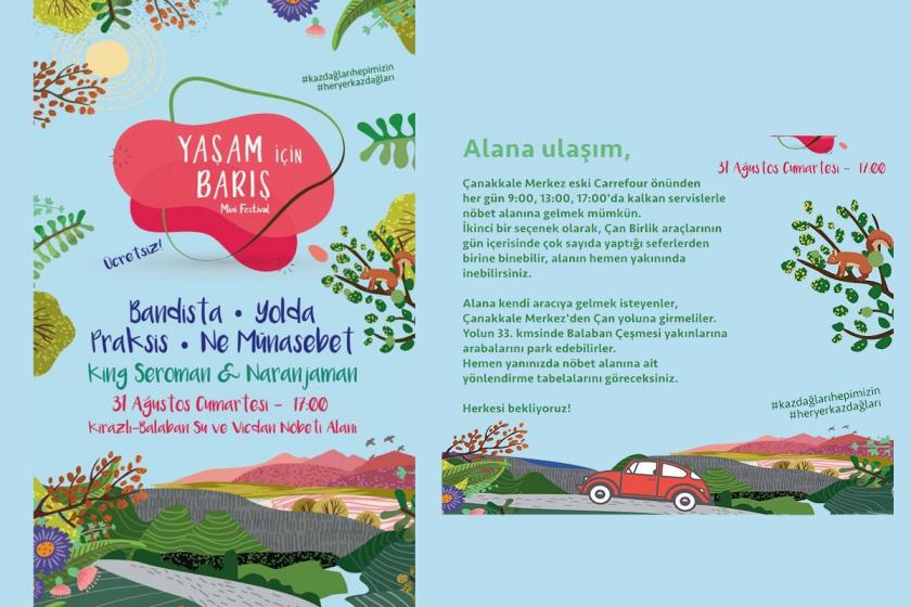 Bandista, Yolda, Praksis, Ne Münasebet gibi müzik gruplarının Kaz Dağları için çalacağı festival, Balaban Su ve Vicdan Nöbet Alanında saat 17.00’de başlayacak. (HABER MERKEZİ)