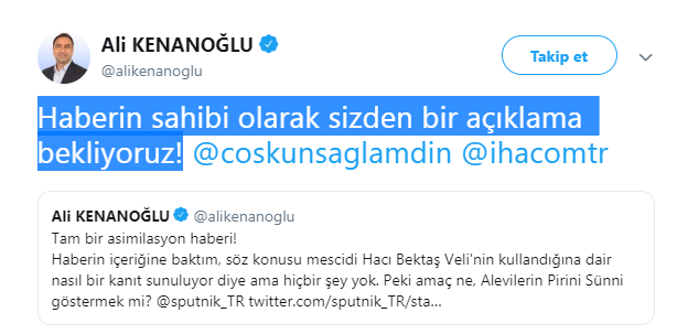 Kenanoğlu, Tweet atarak, “Tam bir asimilasyon haberi! Haberin içeriğine baktım, söz konusu mescidi Hacı Bektaş Veli’nin kullandığına dair nasıl bir kanıt sunuluyor diye ama hiçbir şey yok. Peki amaç ne? Alevilerin Pirini Sünni göstermek mi?” dedi.