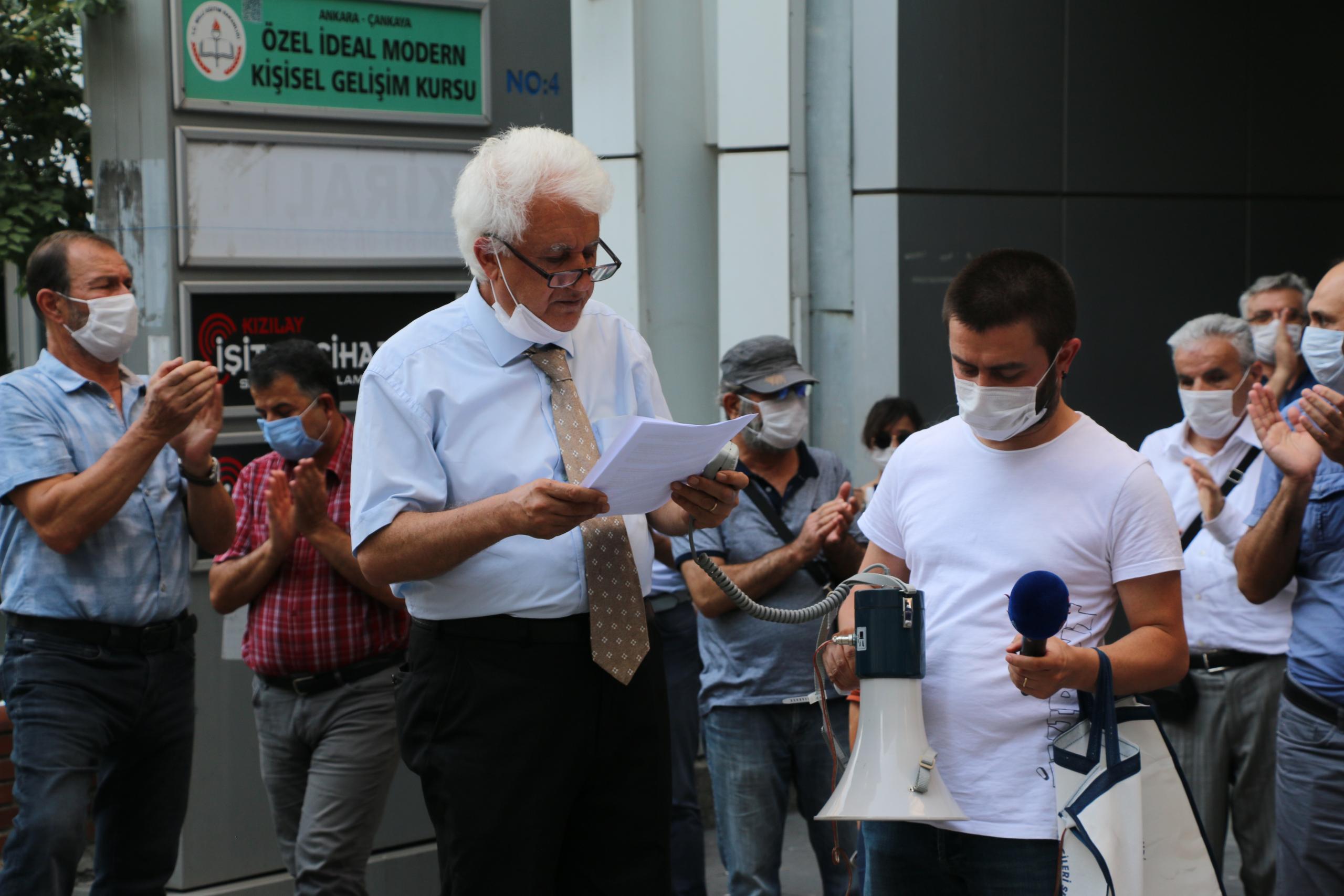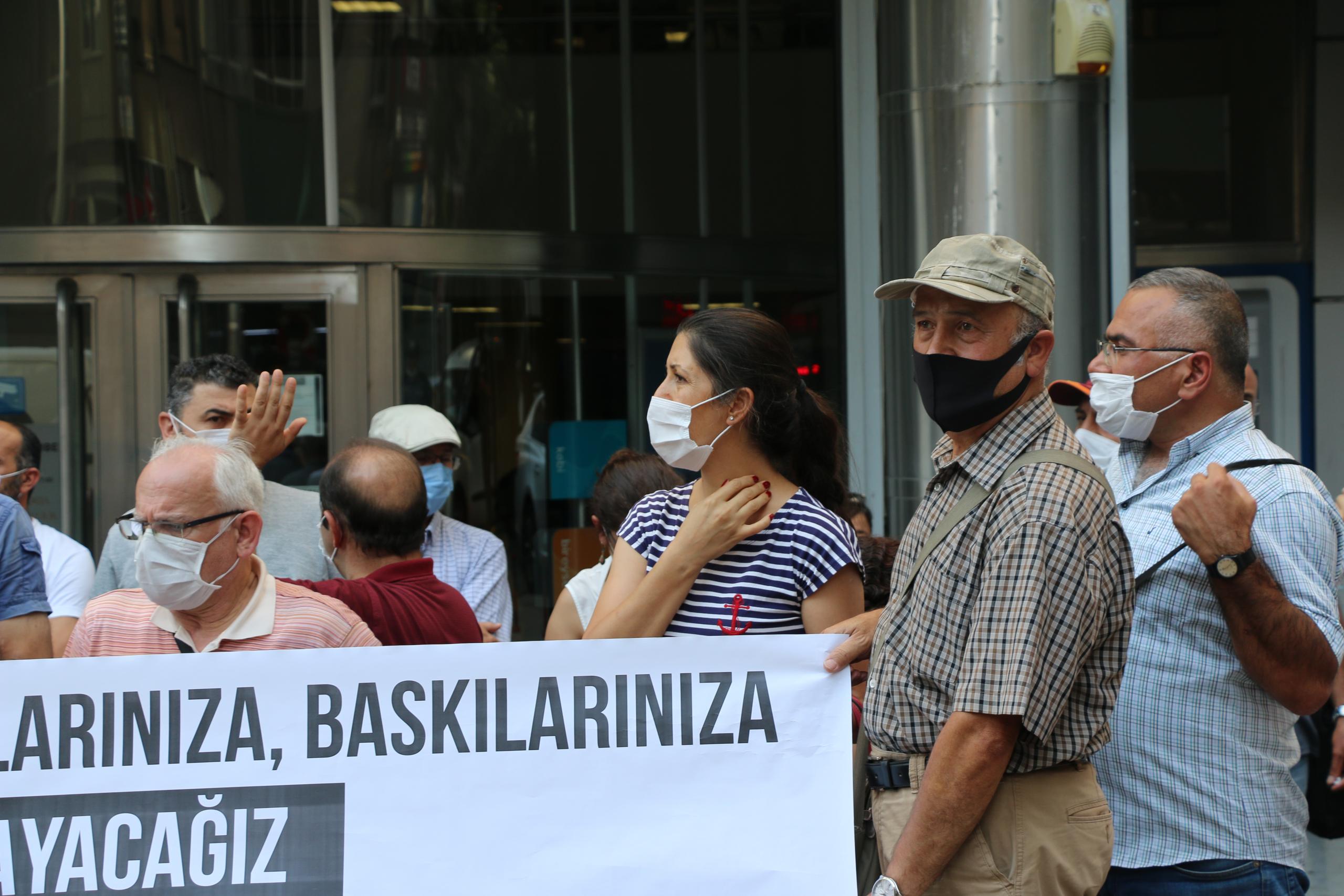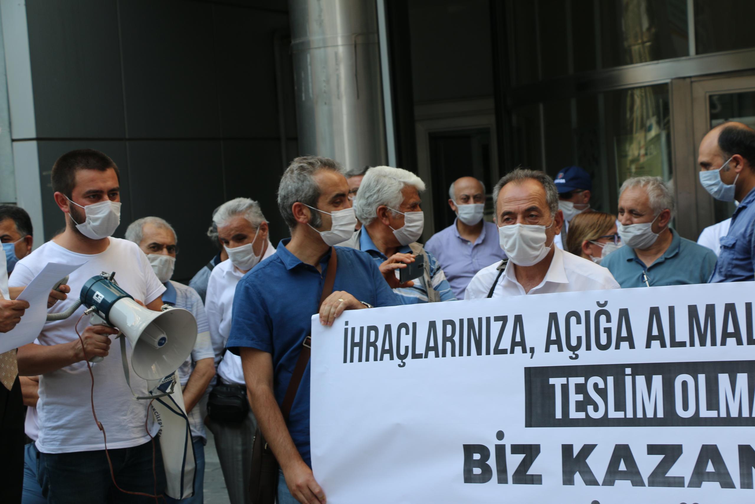 İhraçlarınıza, açığa almalarınıza, baskılarınıza, teslim olmayacağız, Biz kazanacağız geri döneceğiz pankartı açılırken, açıklamayı Büro Emekçileri Sendikası Şube Başkanı Ercan Erdoğan okudu.